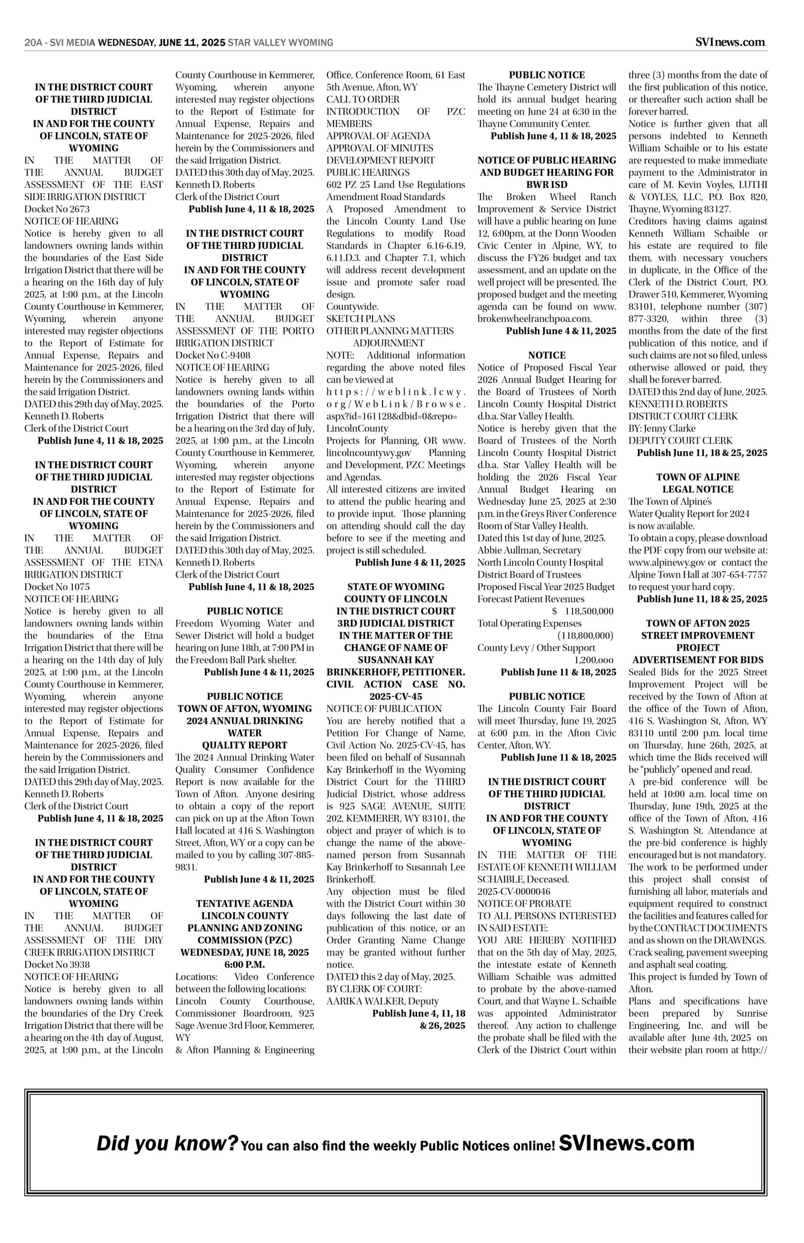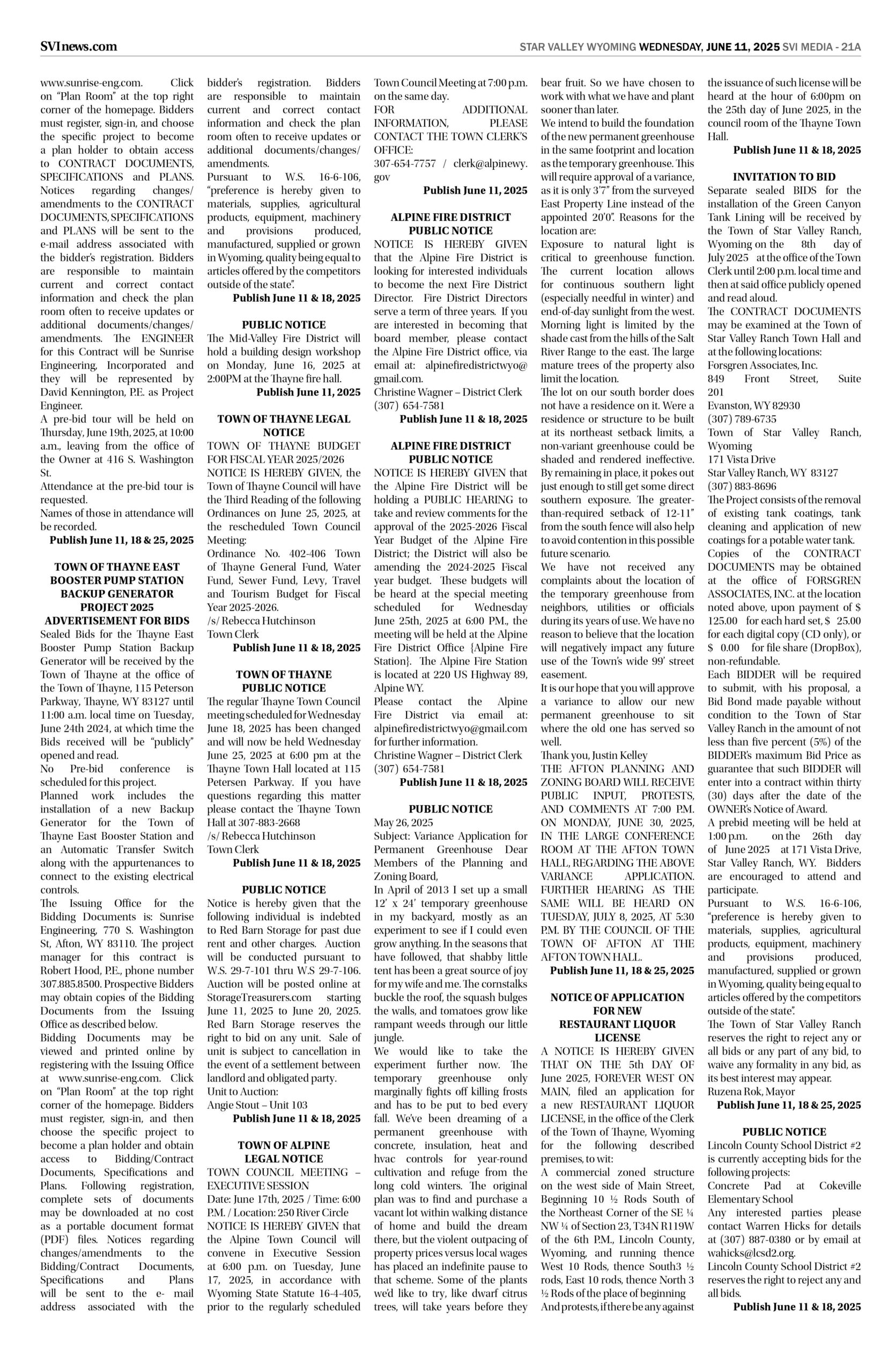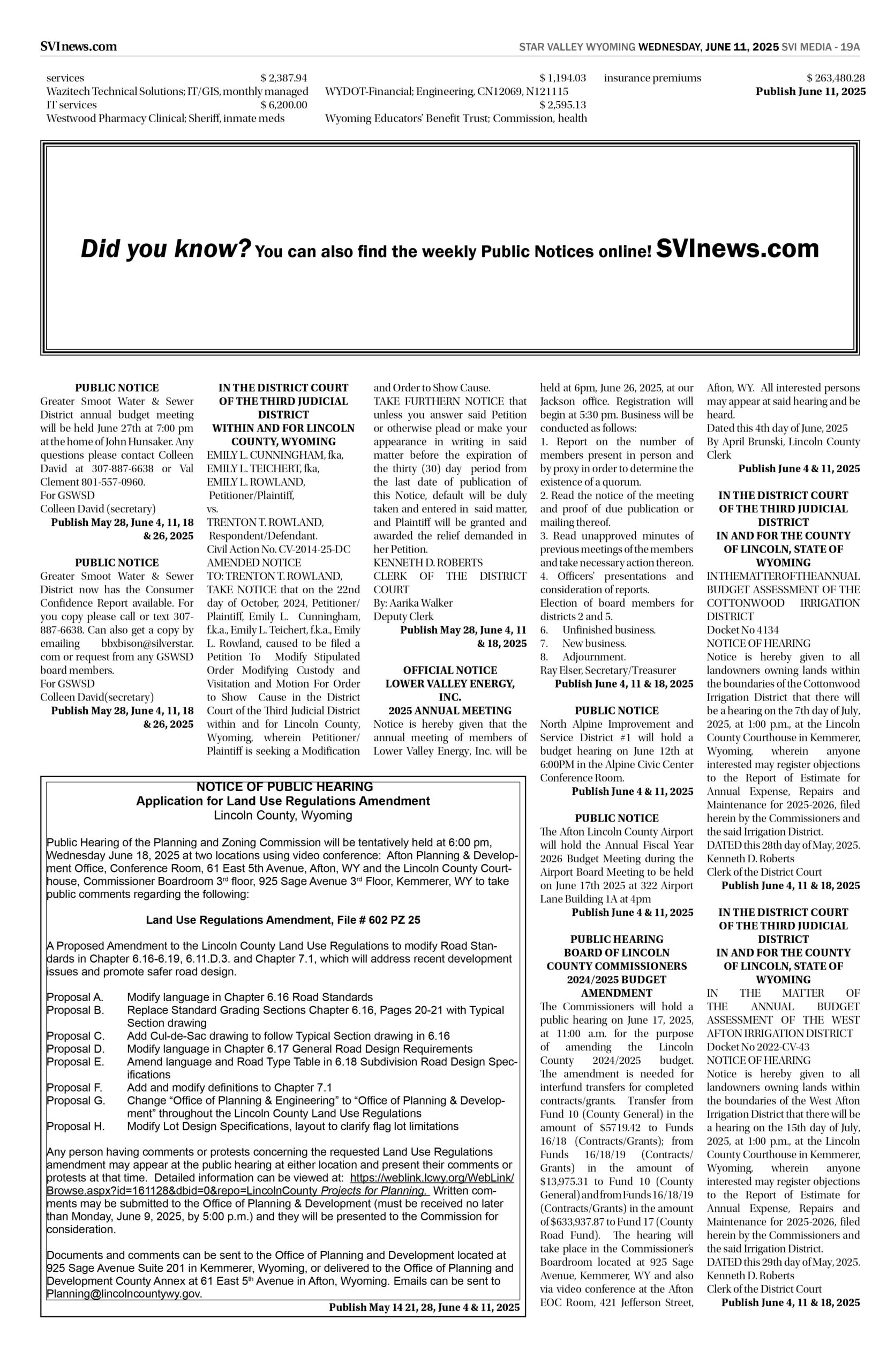 HomepagePublic NoticesJune 11, 2025 Star Valley Independent Public Notices Public Notices June 11, 2025 Star Valley Independent Public Notices Amanda Nelson Posted on June 10, 2025 Post Views: 2,476 Let us know what you think! +1 0 +1 0 +1 0 +1 0 +1 0 +1 0 Post navigation Previous PostSavvy 13-year-old Teton wolf almost breaks all-time age record Next PostMrs. Wyoming hosting benefit for Libertas International You Might Also Like Featured (Photo Gallery) – Salt River Community Theater presents “Damn Yankees” SVI Staff November 29, 2025 Radio Wave Radio Interview: Elf Jr. Cast Duke Dance December 4, 2025 Local News Find gifting success at the Holiday Craft Bazaar Janet Erickson November 19, 2025 Featured Alpine brings second reading on Utility Rate Ordinance SVI Staff November 20, 2025