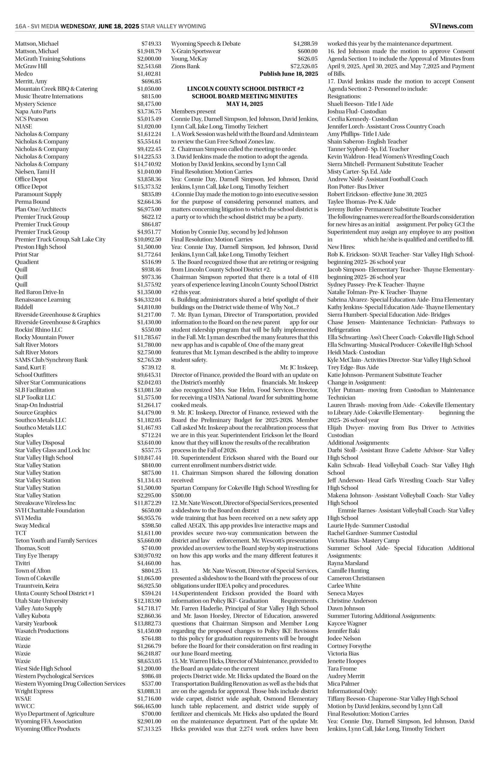 HomepagePublic NoticesJune 18, 2025 Star Valley Independent Public Notices Public Notices June 18, 2025 Star Valley Independent Public Notices Amanda Nelson Posted on June 17, 2025 Post Views: 1,537 Let us know what you think! +1 0 +1 0 +1 0 +1 0 +1 0 +1 0 Post navigation Previous Post(Video) Inaugural season of Star Valley Little League Baseball Next PostBridge construction affecting Star Valley drivers You Might Also Like Featured Star Valley Health and Cigna Reach Agreement to Restore In-Network Access for Patients SVI Staff November 17, 2025 Featured Ryan Yarborough to be inducted into NFF College Football Hall of Fame on Tuesday SVI Staff December 9, 2025 Radio The Wave Radio Interview: Blue Sullivan and Julie Nelson-Bear Lake County Chamber of Commerce Duke Dance November 24, 2025 Featured Laramie County Sheriff’s Office: Operation removes unsafe, unqualified commercial drivers Wyoming News Exchange November 24, 2025