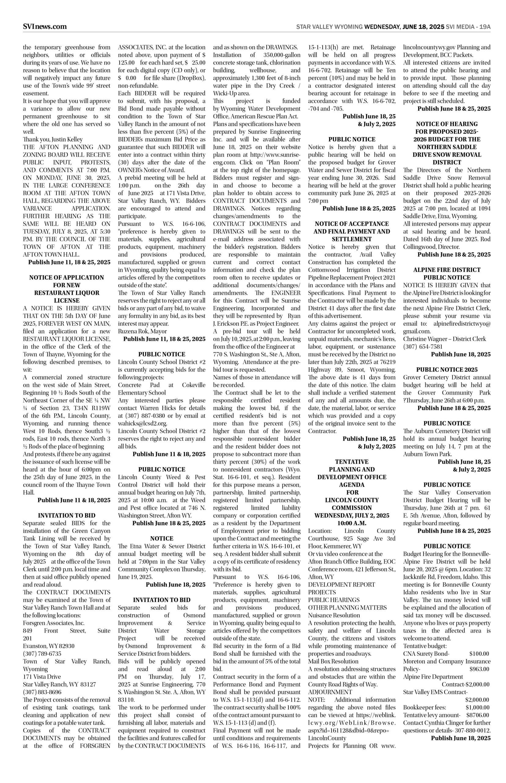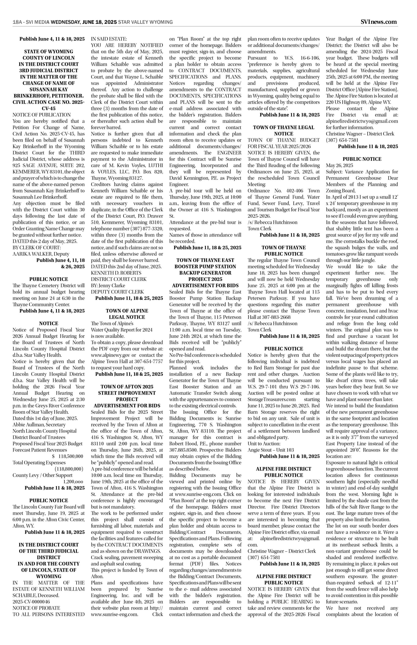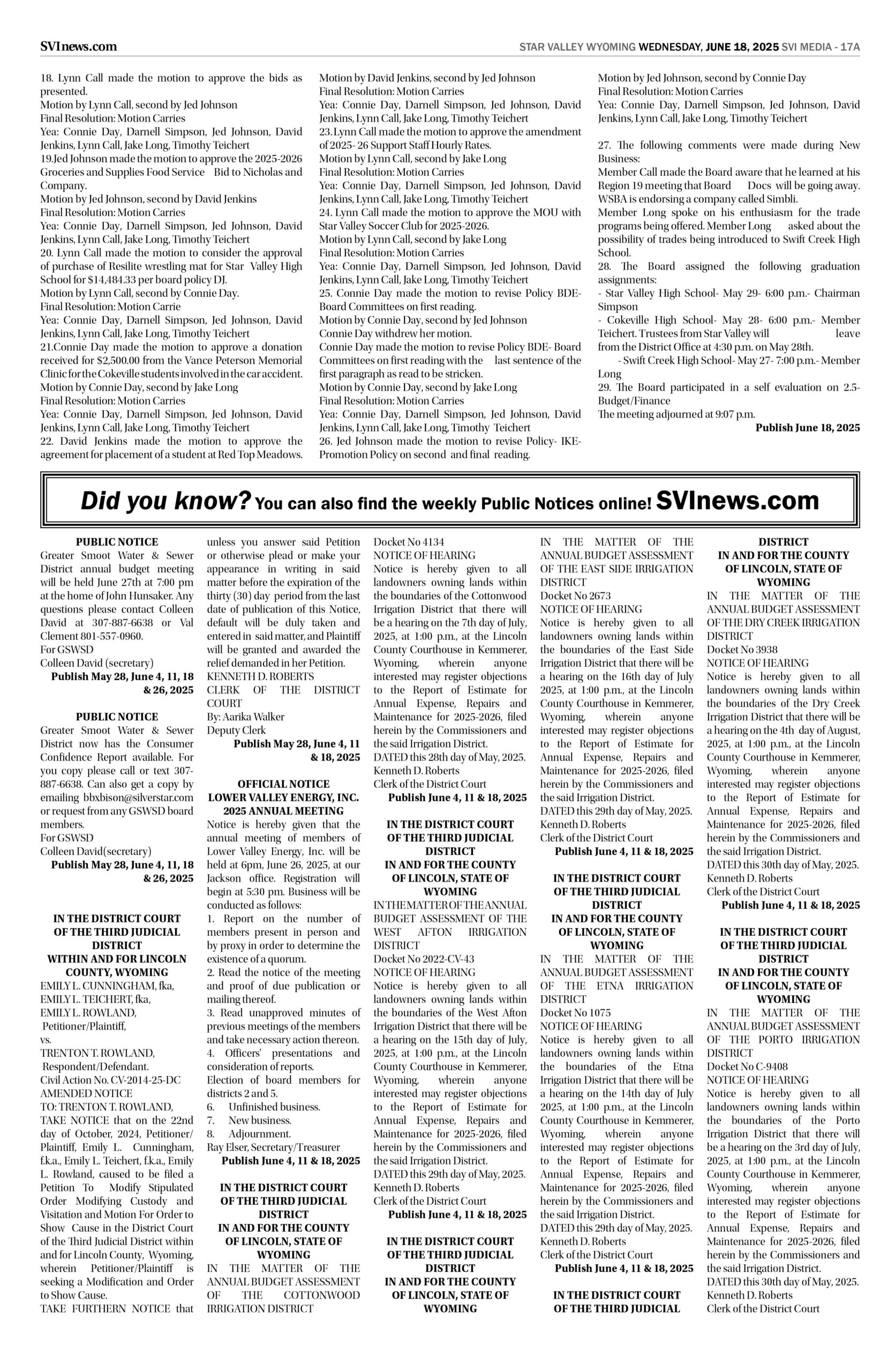 HomepagePublic NoticesJune 18, 2025 Star Valley Independent Public Notices Public Notices June 18, 2025 Star Valley Independent Public Notices Amanda Nelson Posted on June 17, 2025 Post Views: 1,544 Let us know what you think! +1 0 +1 0 +1 0 +1 0 +1 0 +1 0 Post navigation Previous Post(Video) Inaugural season of Star Valley Little League Baseball Next PostBridge construction affecting Star Valley drivers You Might Also Like Featured Urgent call for volunteers and staff at The Turning Point shelter Aubrey Hale November 21, 2025 Featured Merrell sentenced to 3-6 years prison SVI Staff December 3, 2025 Featured Alpine Christmas Craft Fair happening Saturday Janet Erickson December 11, 2025 Featured SVI Radio Interview: Star Valley Chamber of Commerce and Afton Coffee Co. Duke Dance December 10, 2025