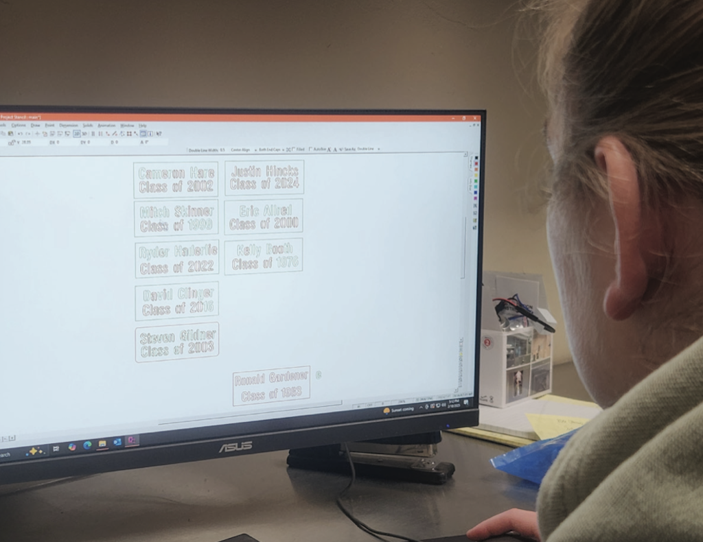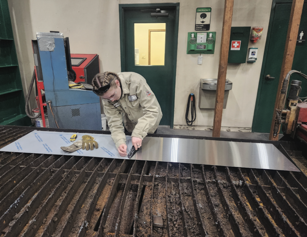Brooke taught Ashlyn how to use a Computer Aided Drafting program for design of the new plaques that would bear the name and graduation year of each student who had passed away. Anna helped Ashlyn learn to run the plasma cutter at PC Industries, which is owned and operated by the Kallgren Family, and which generously supplied all the materials and equipment needed to create ten new stainless-steel plaques. Proficiency with several additional tools was also required, and Ashlyn learned to use all of them as her team worked to remove slag from the plates, then sand and polish them.