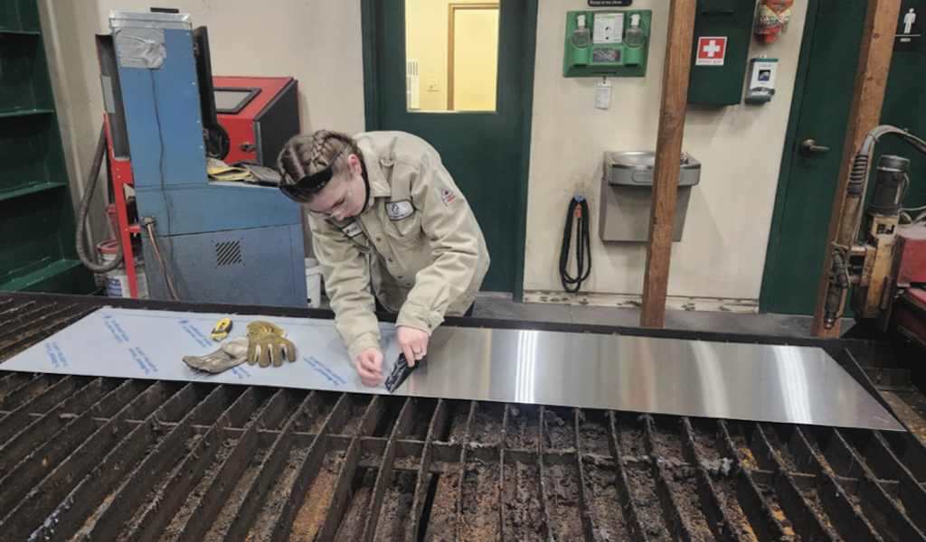 Brooke taught Ashlyn how to use a Computer Aided Drafting program for design of the new plaques that would bear the name and graduation year of each student who had passed away. Anna helped Ashlyn learn to run the plasma cutter at PC Industries, which is owned and operated by the Kallgren Family, and which generously supplied all the materials and equipment needed to create ten new stainless-steel plaques. Proficiency with several additional tools was also required, and Ashlyn learned to use all of them as her team worked to remove slag from the plates, then sand and polish them.