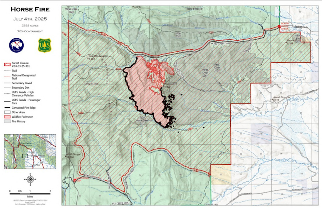 The Horse Fire, currently spanning 2,797 acres in western Sublette County, is now 70% contained as firefighting efforts continue. The primary objective remains the full suppression of the fire, with 69 personnel actively engaged in containment operations.