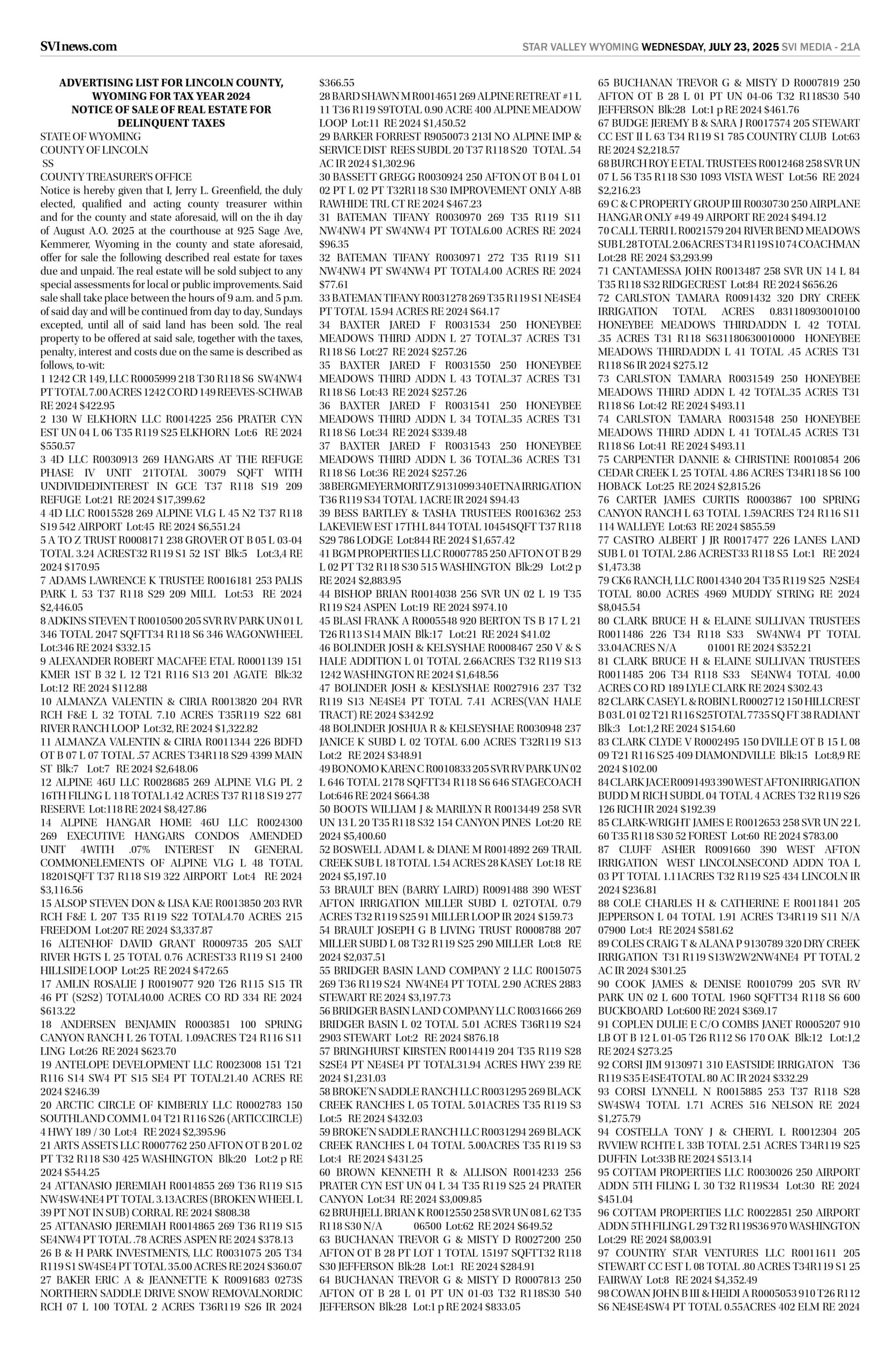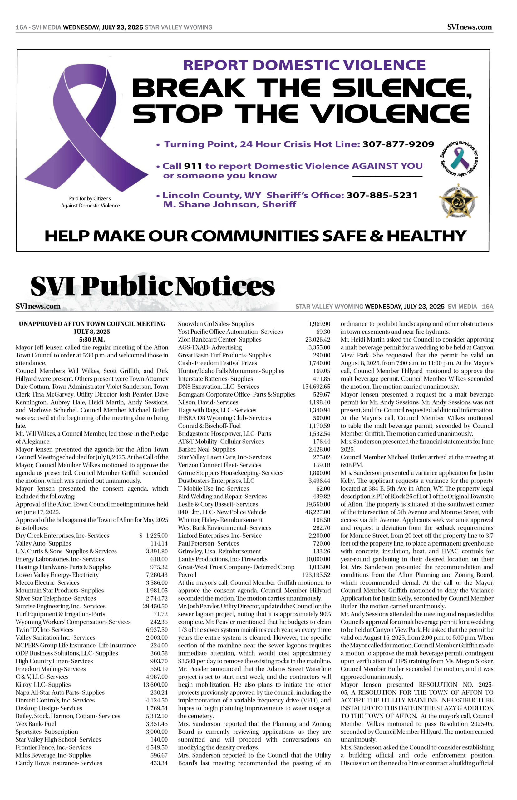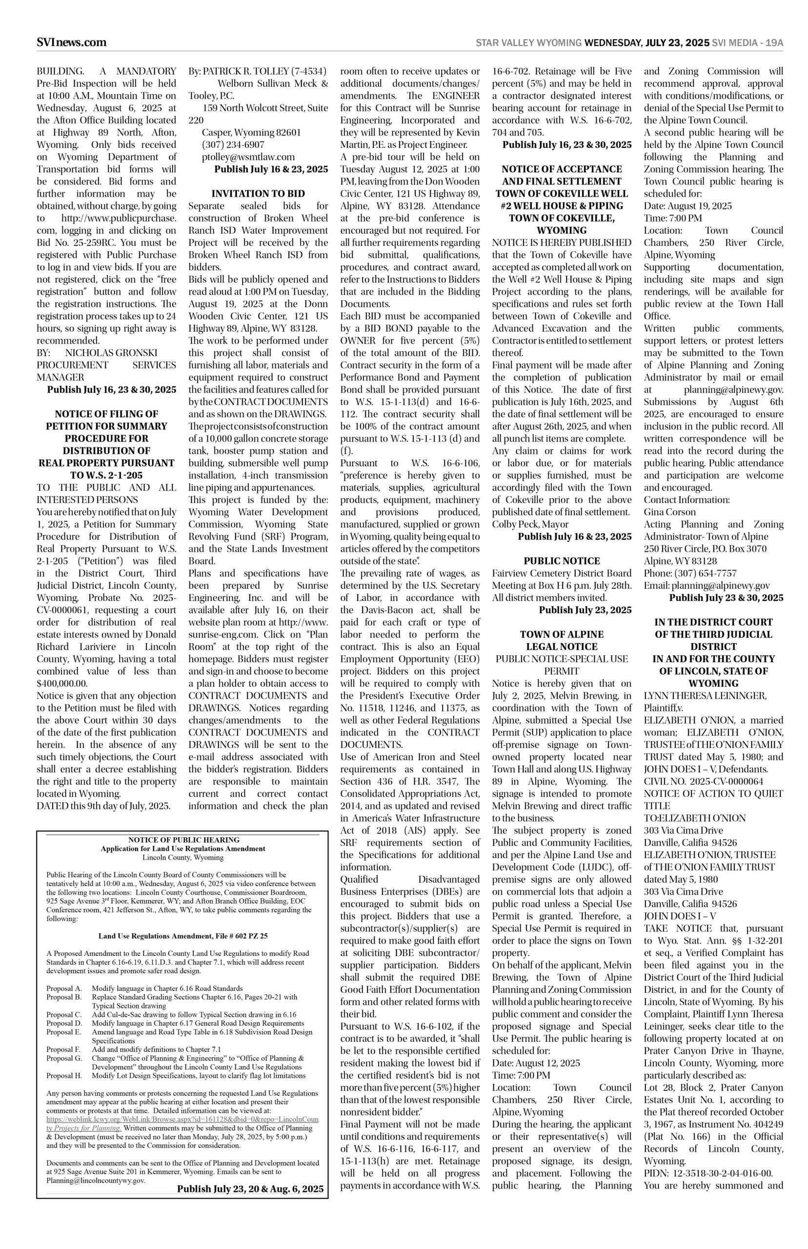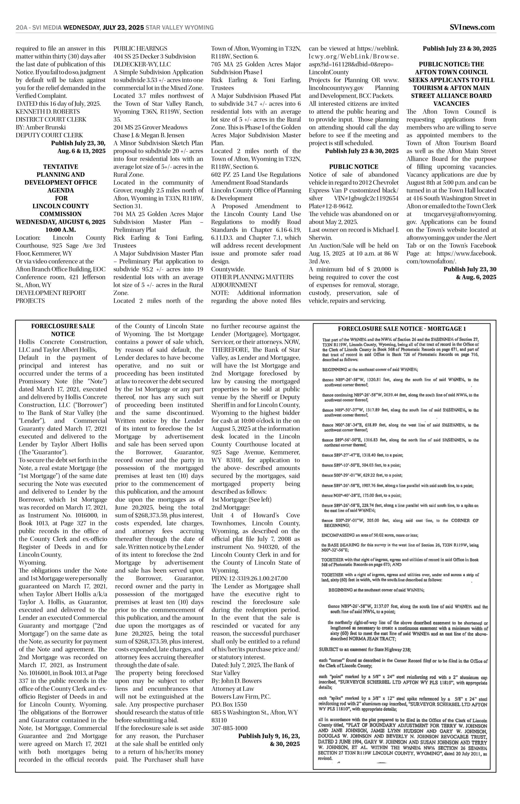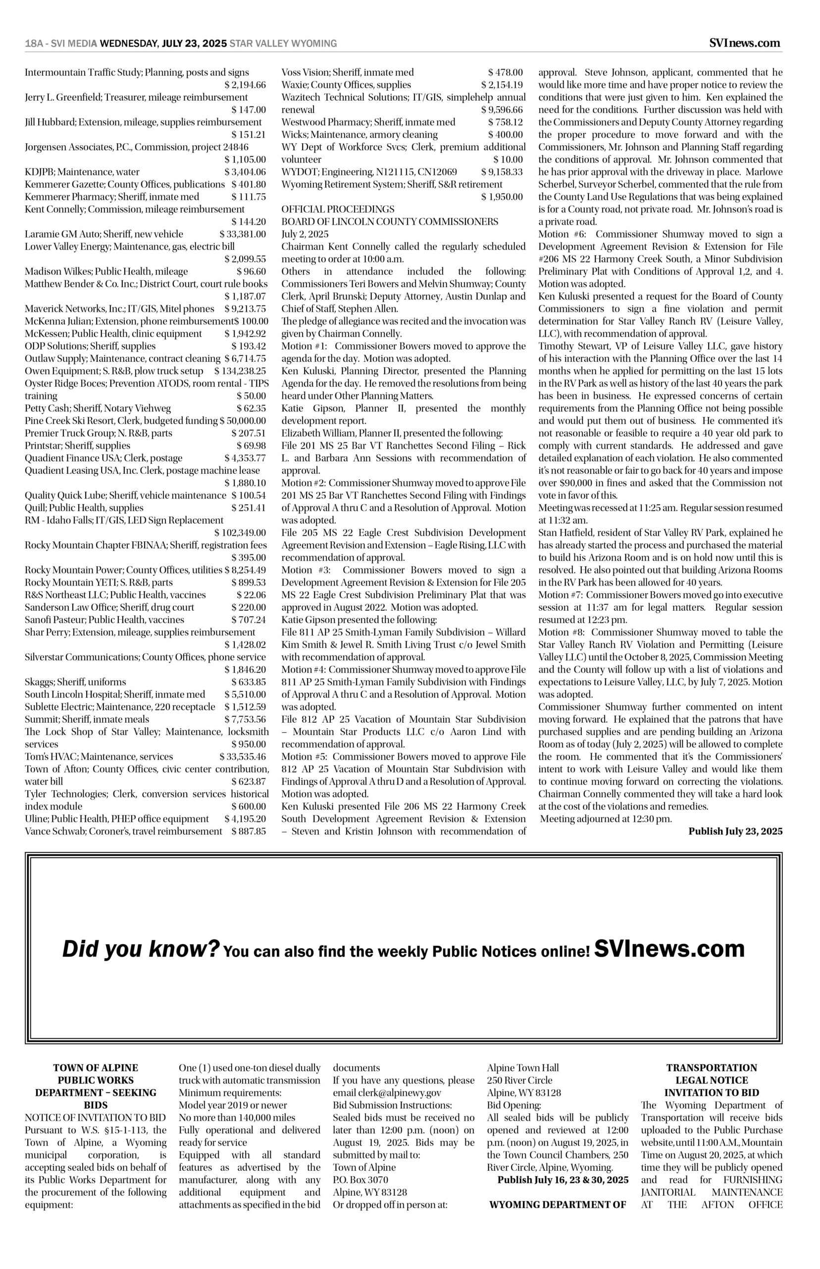 HomepagePublic NoticesJuly 23, 2025 Star Valley Independent Public Notices Public Notices July 23, 2025 Star Valley Independent Public Notices Amanda Nelson Posted on July 22, 2025 Post Views: 2,172 Let us know what you think! +1 0 +1 0 +1 0 +1 0 +1 0 +1 0 Post navigation Previous PostOzzy Osbourne, who led Black Sabbath and became the godfather of heavy metal, dies at 76 Next PostAmy Wierda joins Alpine Town Council You Might Also Like Featured Star Valley Sports Night: December 10, 2025 Duke Dance December 10, 2025 Featured Laramie County Sheriff’s Office: Operation removes unsafe, unqualified commercial drivers Wyoming News Exchange November 24, 2025 Featured Independent Obituaries: December 10, 2025 SVI Staff December 10, 2025 Featured Annual coloring book competition returns to Star Valley Aubrey Hale November 22, 2025