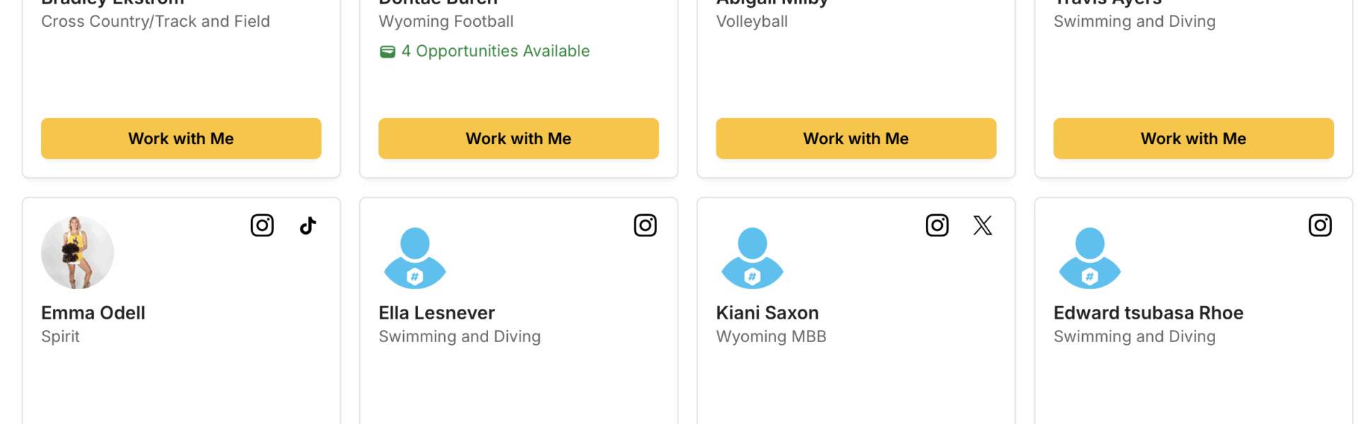 Free to both student-athletes and external entities, the Wyoming Athletics Exchange provides a portal for communicating and fulfilling NIL transactions. After registering with the Wyoming Athletics Exchange, prospective partners can access a database of available Wyoming student-athletes and search, filter and initiate conversations to discuss prospective NIL deals.