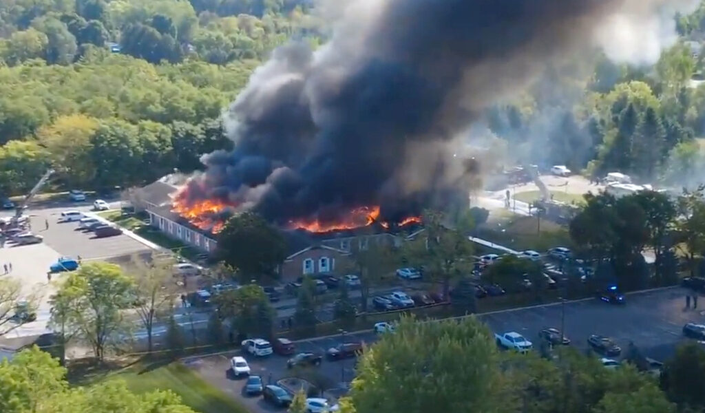 In this image taken from video released by Julie J, @Malkowski6April, Massive flames and smoke rise from The Church of Jesus Christ of Latter-day Saints in Grand Blanc, about 50 miles north of Detroit, Sunday, Sept. 28, 2025. (Julie J, @Malkowski6April via AP)
