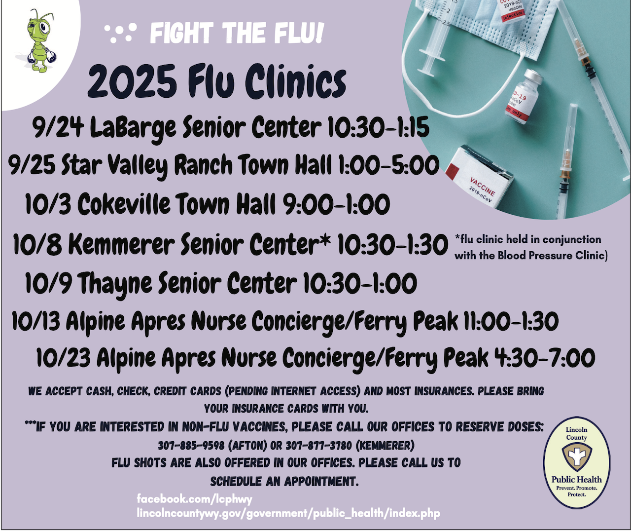 Late September and October Flu Shot Clinics, hosted by Lincoln County Public Health (LCPH), will be held throughout Star Valley and surrounding Lincoln County to better prepare the public for flu season.