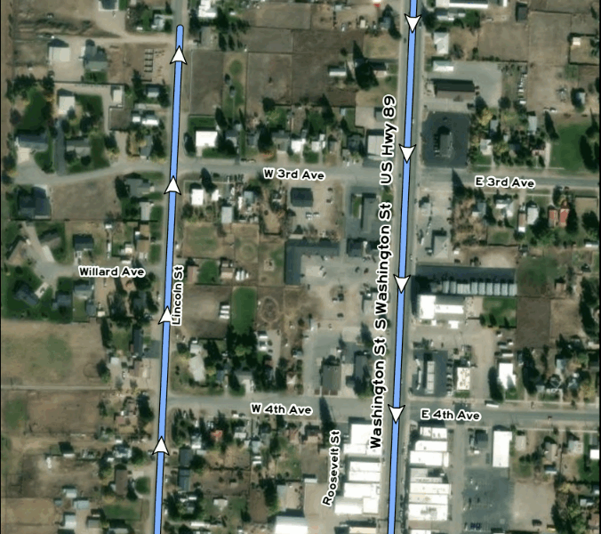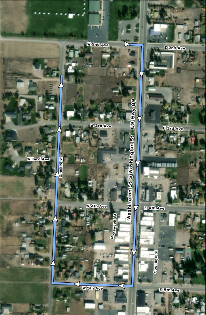 The revised parade route will begin at the Lincoln County Fairgrounds, located at the intersection of Washington St (US-89) and West 2nd Avenue. The parade will proceed south along Washington St (US-89), passing 3rd and 4th Avenues, before turning right onto 5th Avenue. Participants will then continue along 5th Avenue to Lincoln Street, where they will turn right again, heading north back to the Lincoln County Fairgrounds. The parade will conclude near the fairgrounds.
