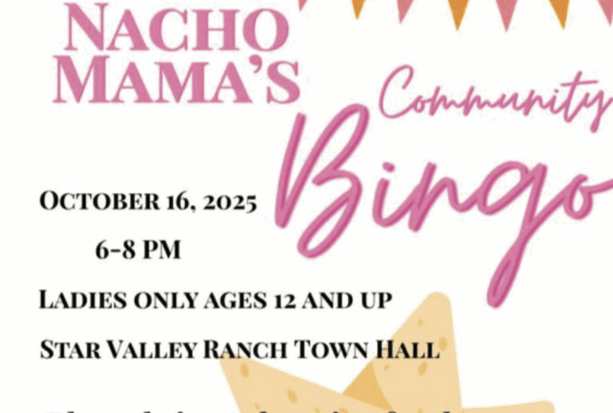 The “Nacho Mama’s Community Bingo” night will be held Thursday, October 16, from 6–8 p.m. at the Star Valley Ranch Town Hall. The event is open to ladies ages 12 and up, with refreshments provided.