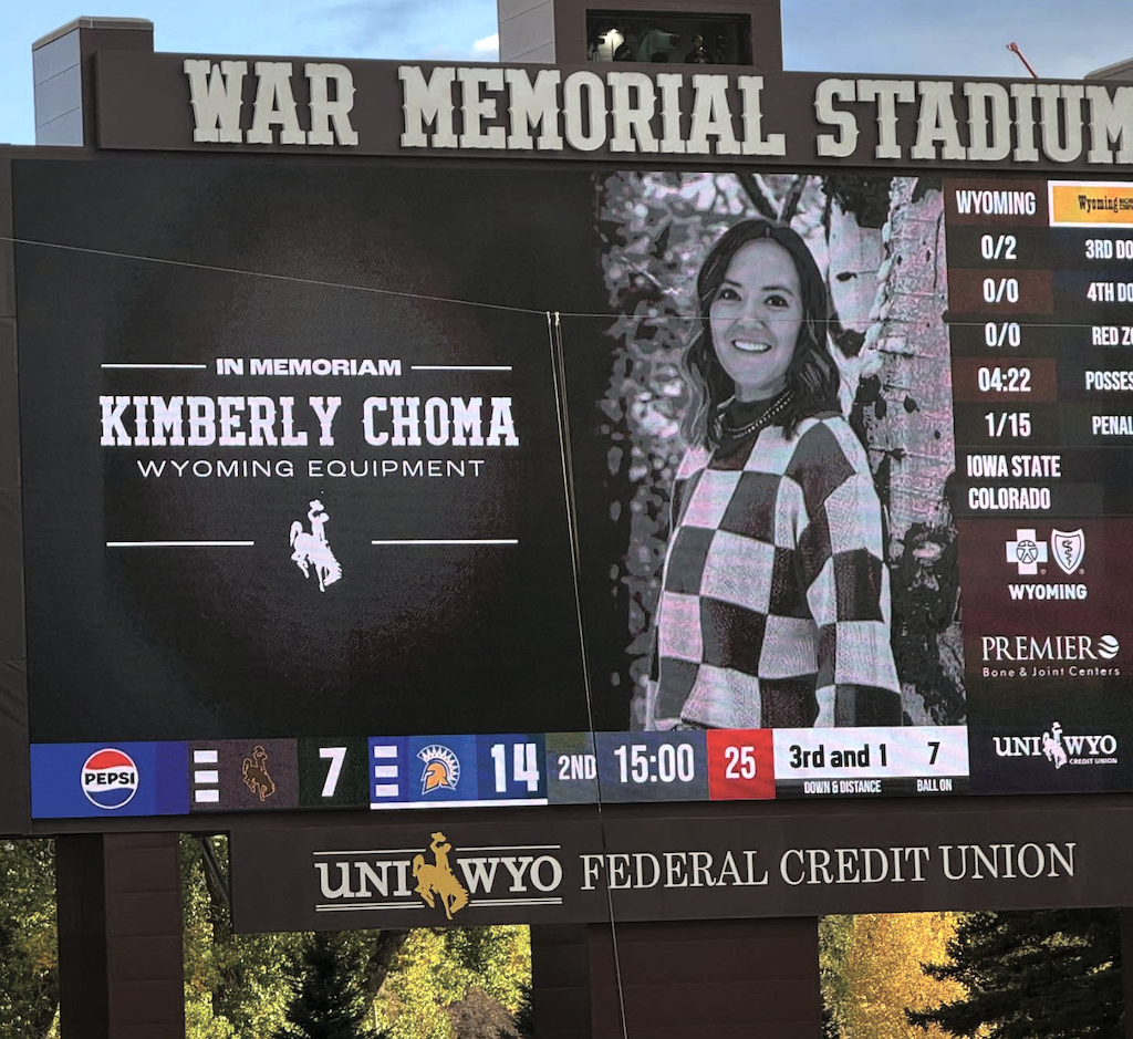 Those in attendance at War Memorial Stadium in Laramie paused to honor the life of Kim Choma on October 11 as the Wyoming Cowboys faced the San Jose State Spartans. Kim was placed on the video board and a moment was taken by the thousands in attendance to remember the UW equipment manager who’s life was tragically taken in late June of this year.