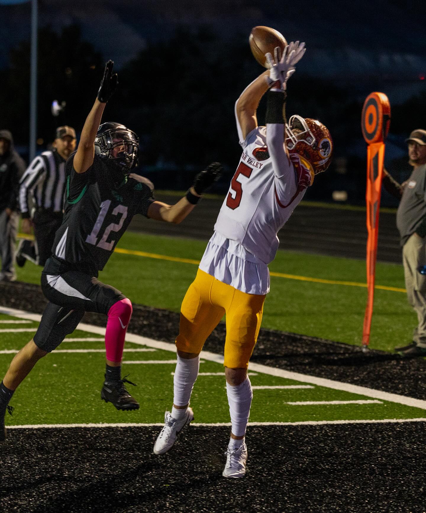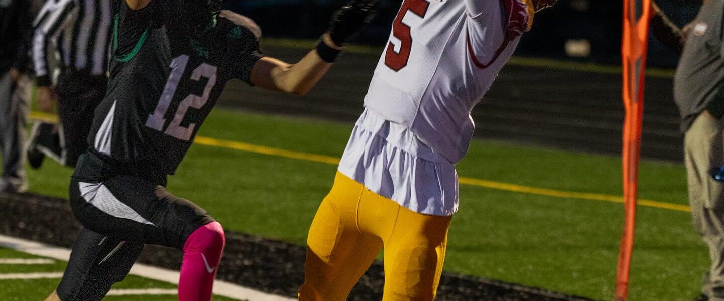 Star Valley’s Dax Button hauls in a touchdown reception against the Green River Wolves. (PHOTO BY NATE HOVEY)