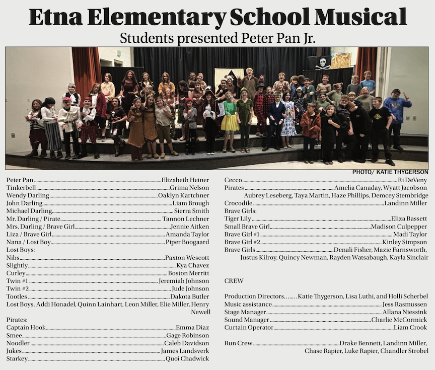 HomepageFeaturedPhoto Gallery: Etna Elementary presents Peter Pan Jr. Featured Local News TV Screen News Photo Gallery: Etna Elementary presents Peter Pan Jr. SVI Staff Posted on November 28, 2025 Post Views: 314 PHOTOS BY JANET ERICKSONĀ Let us know what you think! +1 0 +1 0 +1 0 +1 0 +1 0 +1 0 LEAVE A RESPONSE Cancel replyYou must be logged in to post a comment. Post navigation Previous PostVisser nabs All-American status for Weber State Next PostADM figures will bring some classification changes starting next school year You Might Also Like Featured Independent Notes: The youth are good examples. Dan Dockstader November 23, 2025 Interviews SVI Radio Interview: Bridget Stewart, Kemmerer High School Job Fair Duke Dance November 20, 2025 Local News House damaged in high-speed Thanksgiving crash Dahl Erickson December 3, 2025 Featured Inaugural Alpine Harvest Craft Fair is Saturday, November 15 Janet Erickson November 13, 2025