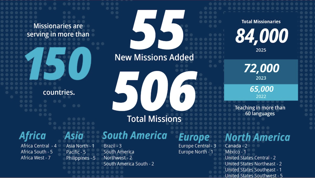The number of young teaching and service missionaries and senior missionaries has gone from just over 65,000 at the end of 2022 to nearly 72,000 at the end of 2023 and is currently at more than 84,000. They serve in more than 150 countries and teach in more than 60 languages.