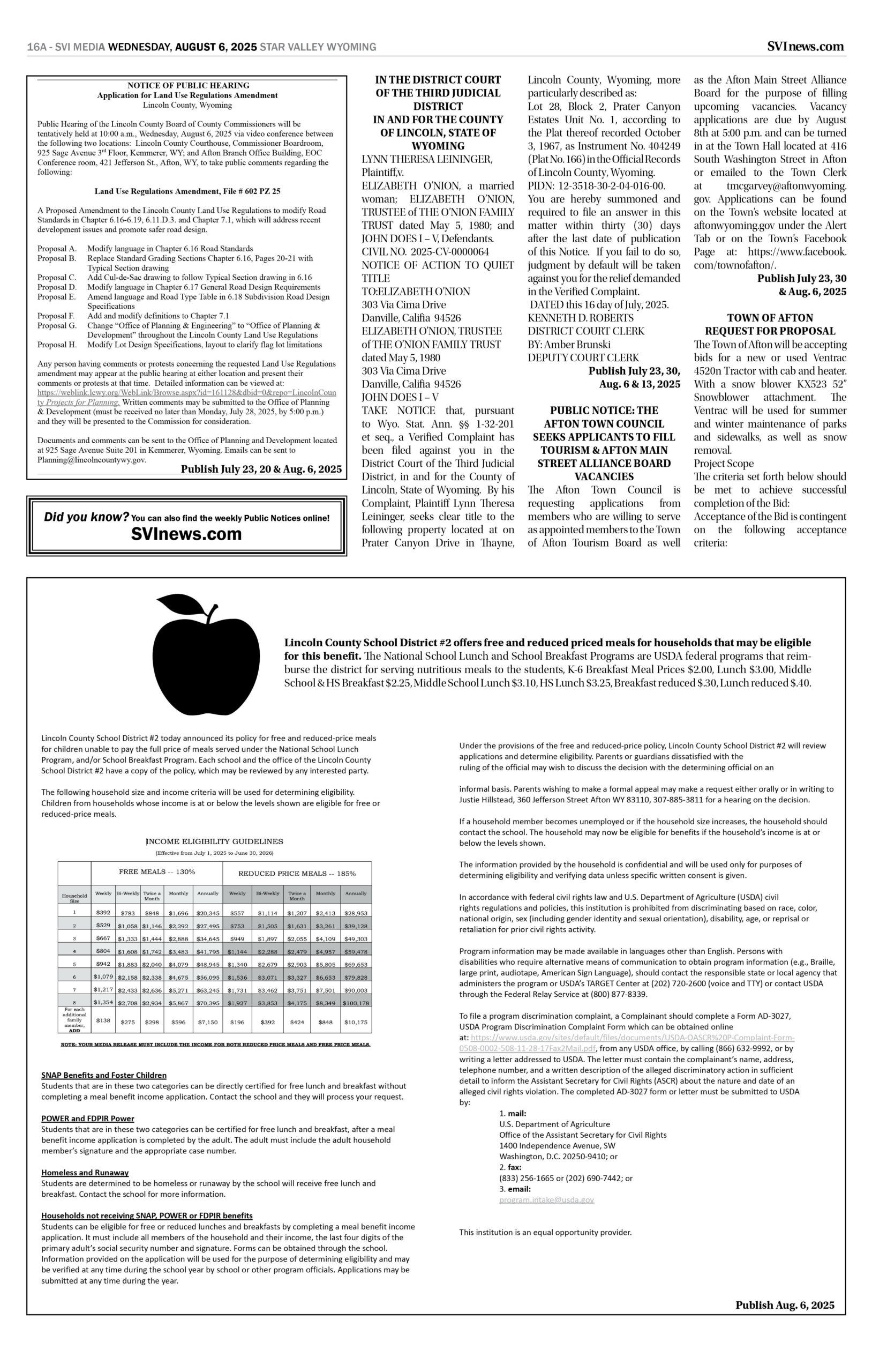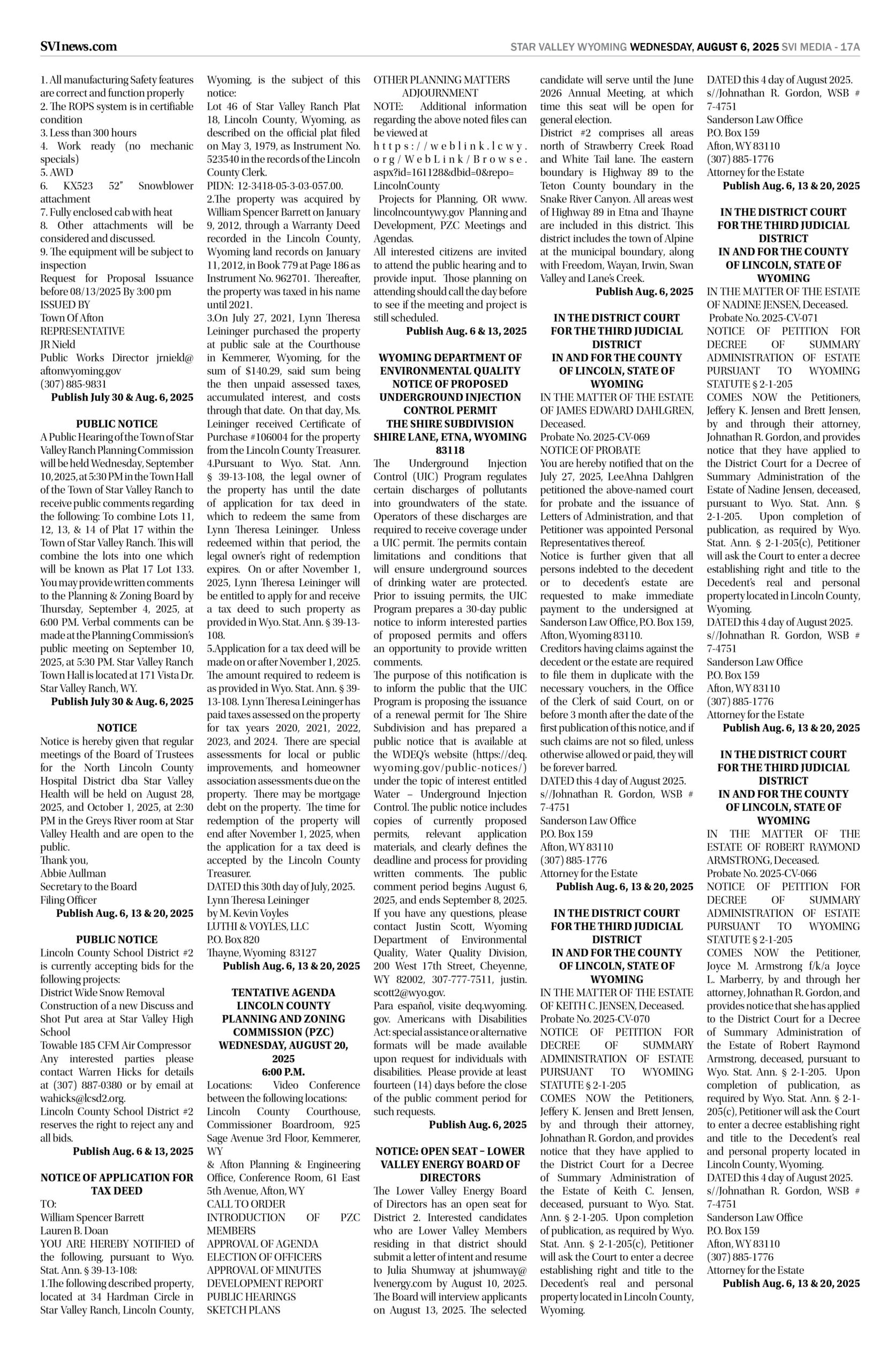 HomepagePublic NoticesAugust 6, 2025 Star Valley Independent Public Notices Public Notices August 6, 2025 Star Valley Independent Public Notices Amanda Nelson Posted on August 5, 2025 Post Views: 2,257 Let us know what you think! +1 0 +1 0 +1 0 +1 0 +1 0 +1 0 Post navigation Previous PostGordon to deploy Wyoming National Guard to support ICE in Trump’s mass deportation effort Next PostLower Valley Energy accepting board applications You Might Also Like Featured Book signing for Randy Tucker’s book, “Rails to Trails on the Sweetwater” will be November 20, at the Lander Pioneer Museum. SVI Staff November 9, 2025 Local News Braves edge Cody 26-21 to claim fourth straight 3A title Dahl Erickson November 14, 2025 News Lawmakers advance measure shortening public records request timelines Wyoming News Exchange November 13, 2025 Featured Life in Alpine Photo Contest is open to those 18+ years Aubrey Taylor November 8, 2025