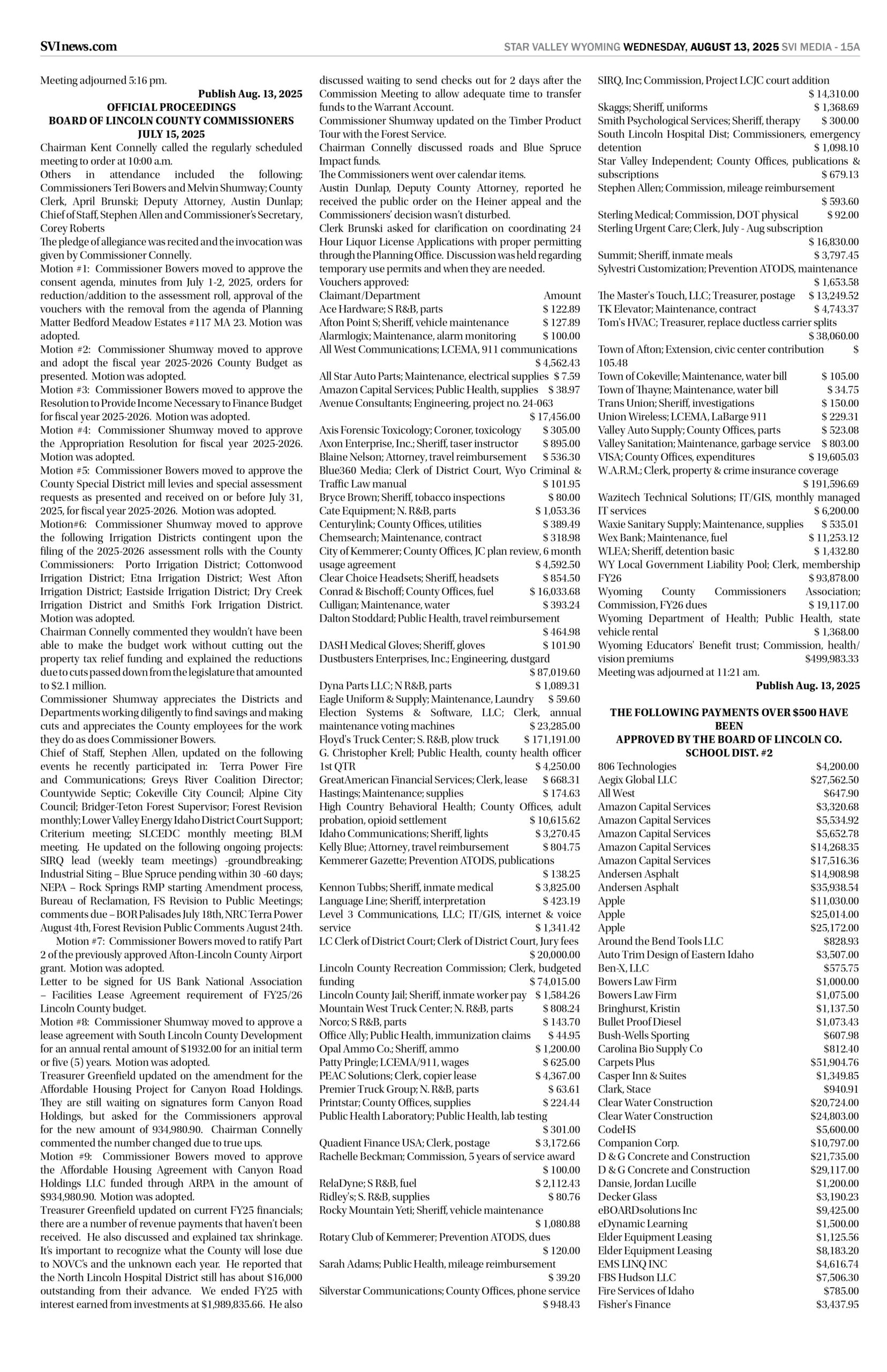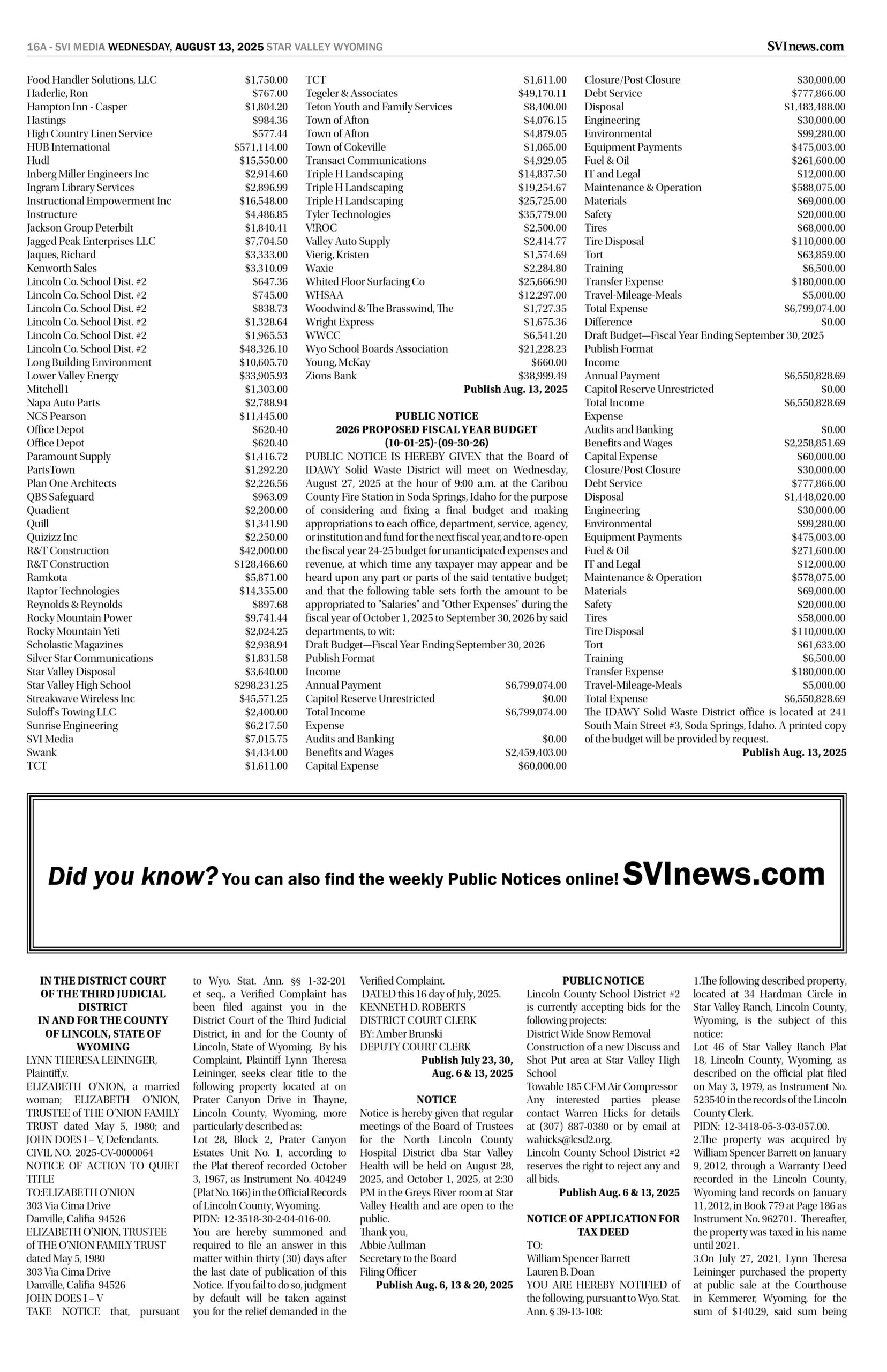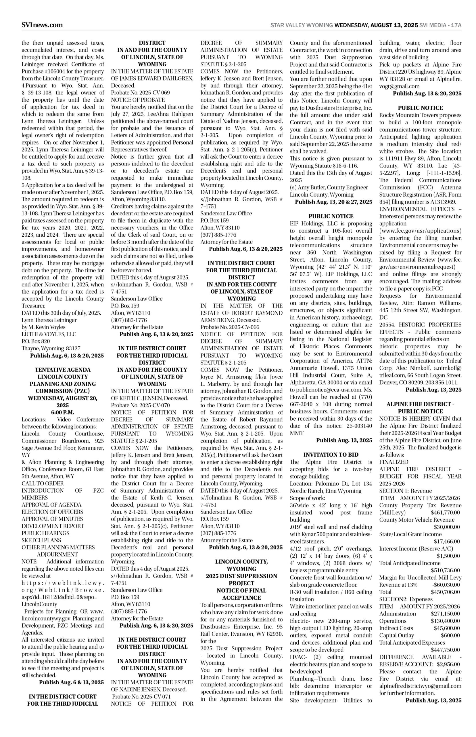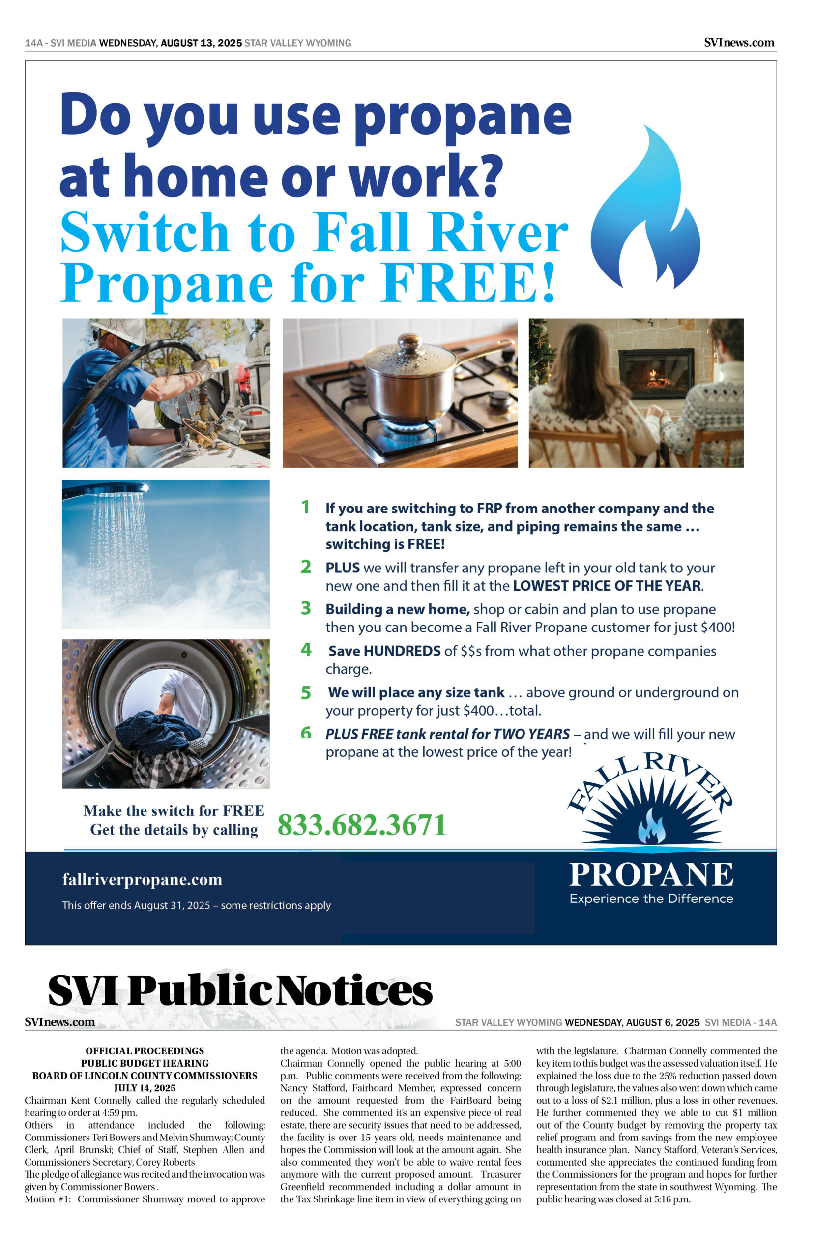 HomepagePublic NoticesAugust 13, 2025 Star Valley Independent Public Notices Public Notices August 13, 2025 Star Valley Independent Public Notices Amanda Nelson Posted on August 12, 2025 Post Views: 2,101 Let us know what you think! +1 0 +1 0 +1 0 +1 0 +1 0 +1 0 Post navigation Previous PostVeteran Wyoming News Execs announce agreement to save eight newspapers Next PostJury sides with Town of Afton You Might Also Like Featured Senator Barrasso Pays Tribute to Vice President Dick Cheney SVI Staff November 6, 2025 Featured MLB, sportsbooks cap bets on individual pitches in response to pitch-rigging scandal AP November 11, 2025 Featured BLM seeks additional input for resource management plan in southwestern Wyoming SVI Staff November 6, 2025 Featured SVI Radio Interview: Jeremy Larsen, Alpine Town Council Duke Dance December 3, 2025
