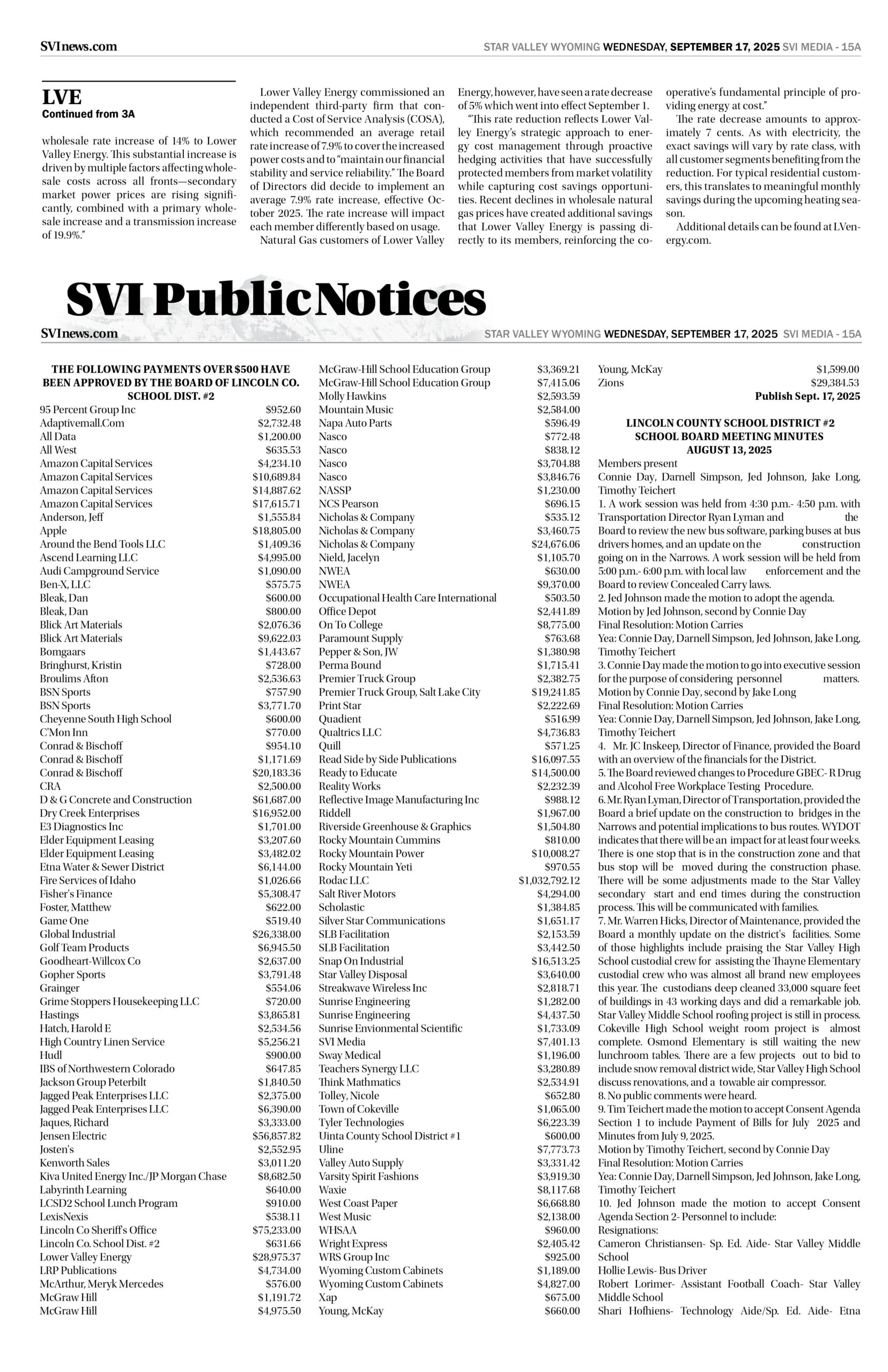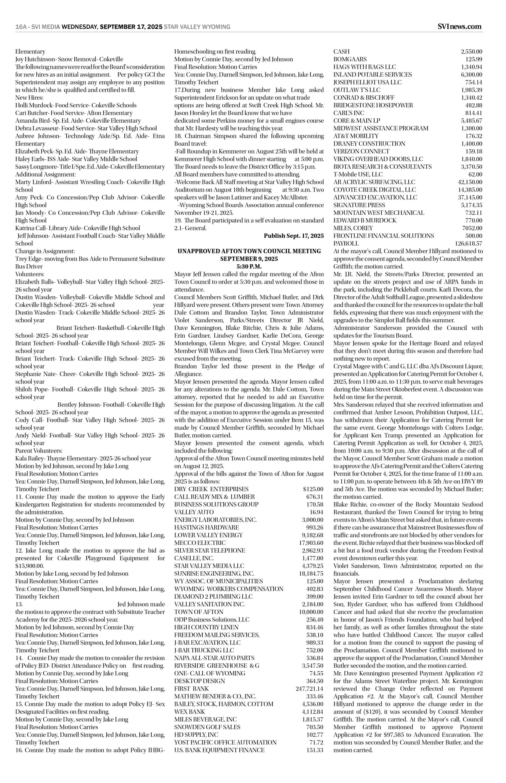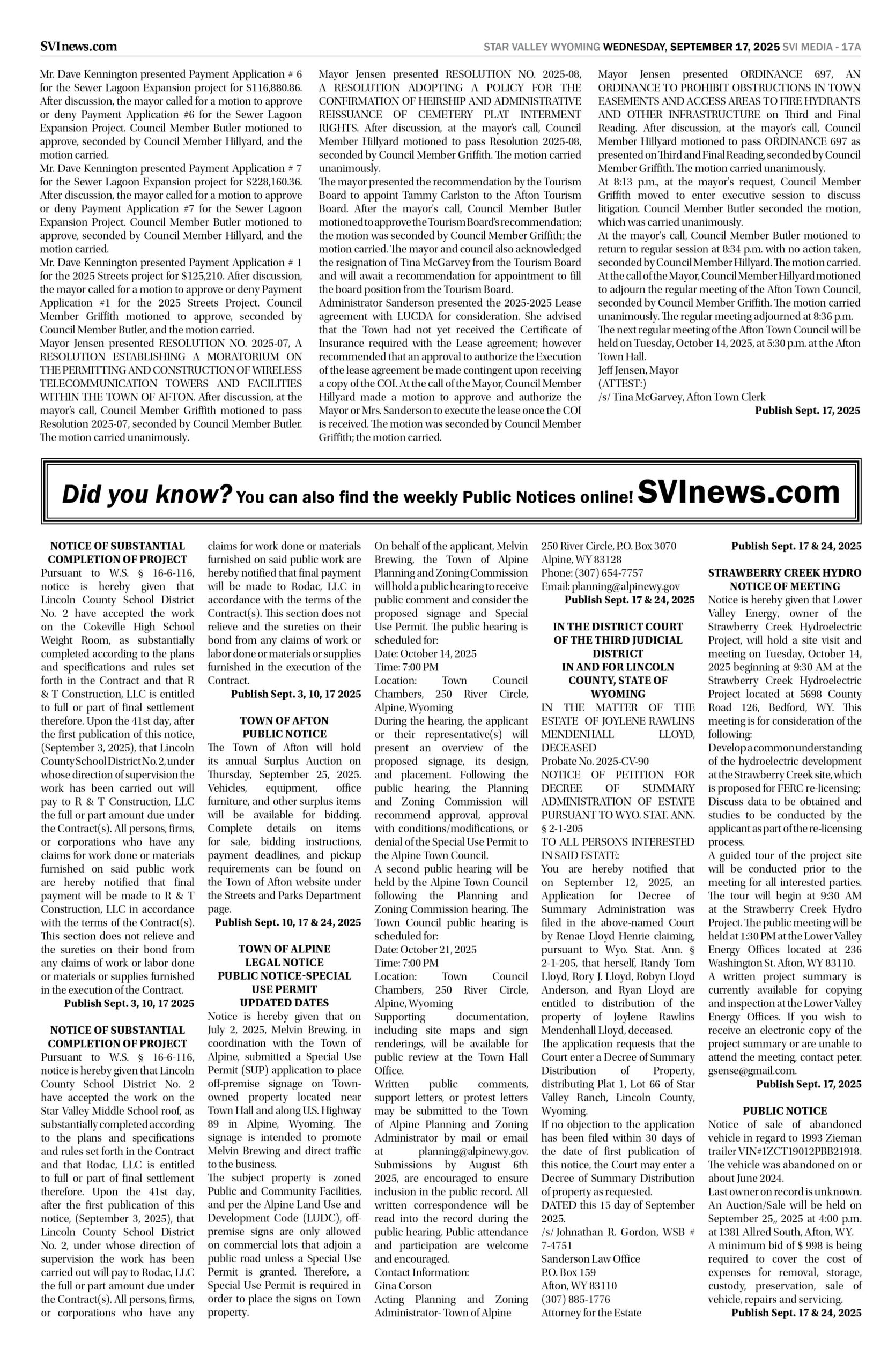 HomepagePublic NoticesSeptember 17, 2025 Star Valley Independent Public Notices Public Notices September 17, 2025 Star Valley Independent Public Notices Amanda Nelson Posted on September 17, 2025 Post Views: 1,508 Let us know what you think! +1 0 +1 0 +1 0 +1 0 +1 0 +1 0 Post navigation Previous PostSVI Radio Radio: Chad Baldwin, University of Wyoming Next PostFederal Reserve cuts key rate by quarter-point and signals two more cuts this year You Might Also Like Regional News Police shoot, kill suspect at casino Wyoming News Exchange December 4, 2025 Featured SVI Radio Interview: Amber Schalk, Magic of Believing with Team Tetons Duke Dance December 4, 2025 Featured LCSD#2 School Board Meeting Notes Dahl Erickson November 21, 2025 Featured Life in Alpine Photo Contest is open to those 18+ years Aubrey Taylor November 8, 2025
