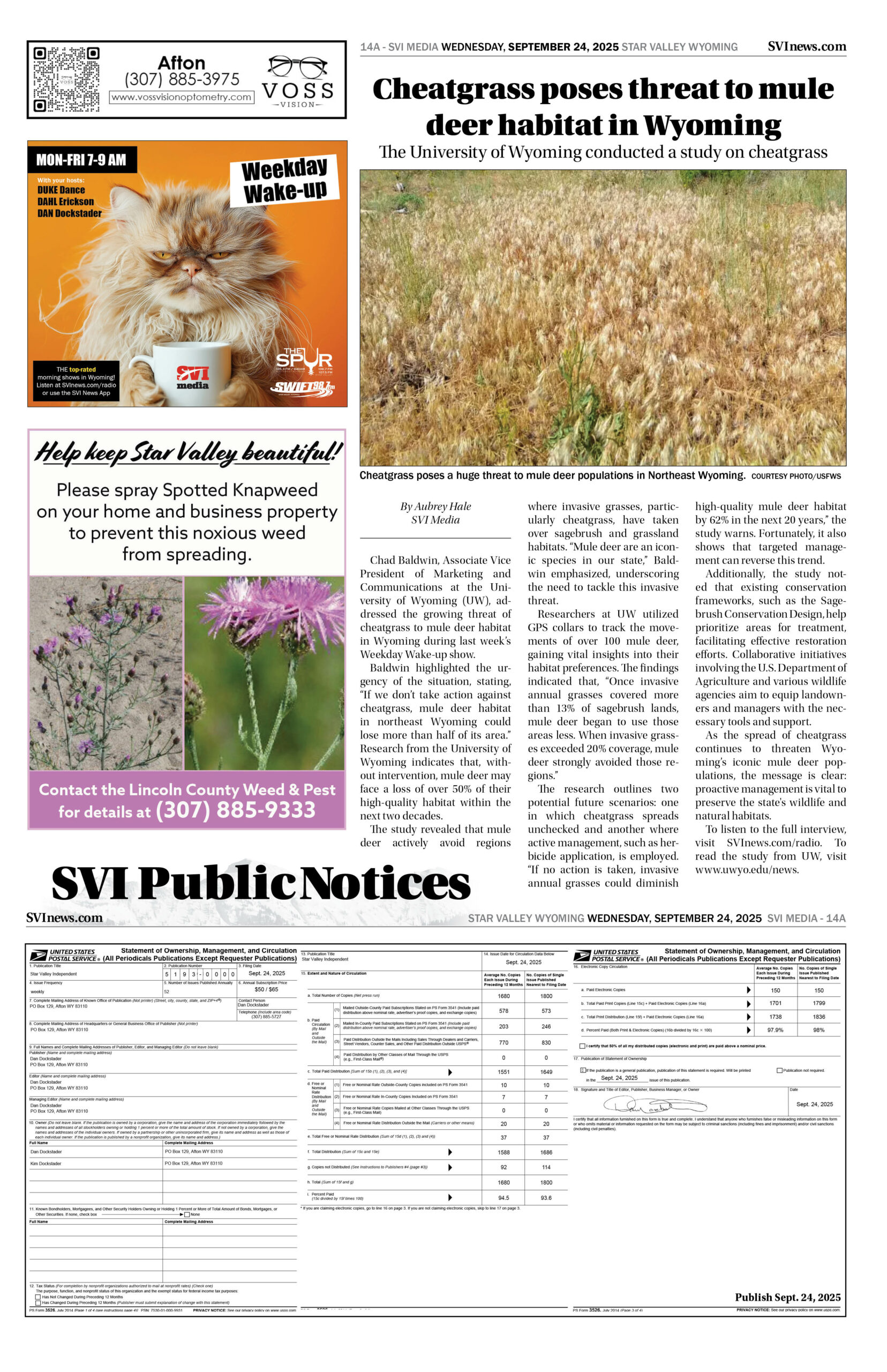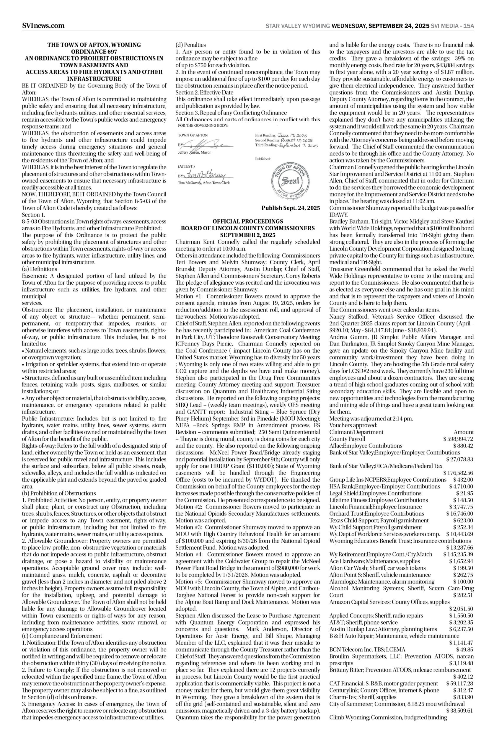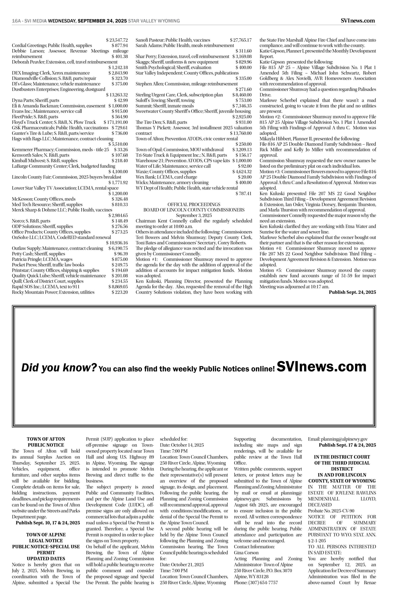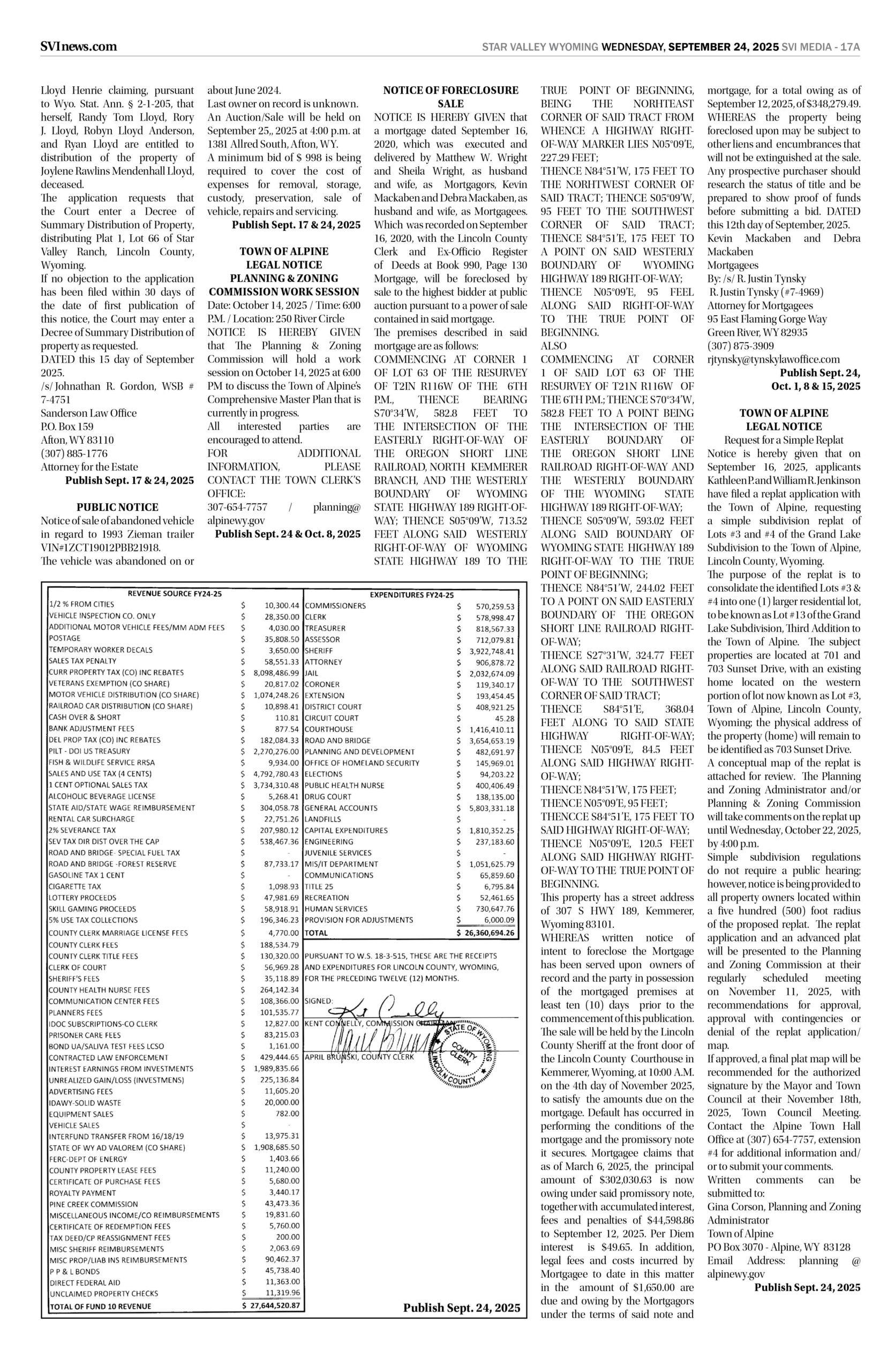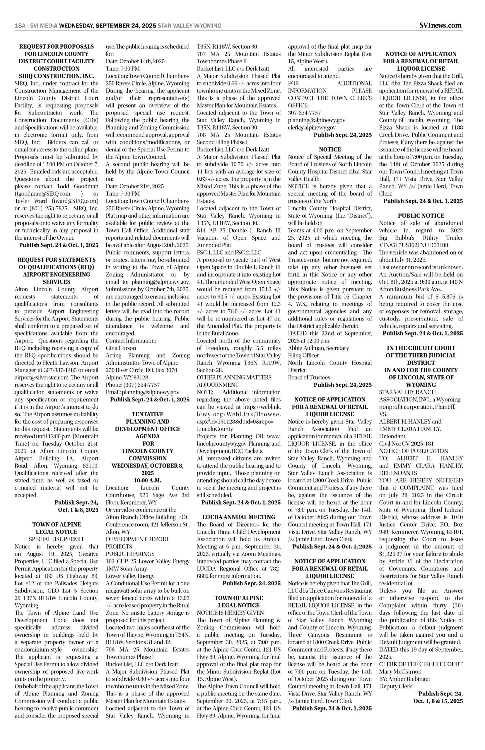 HomepagePublic NoticesSeptember 24, 2025 Star Valley Independent Public Notices Public Notices September 24, 2025 Star Valley Independent Public Notices Amanda Nelson Posted on September 23, 2025 Post Views: 1,409 Let us know what you think! +1 0 +1 0 +1 0 +1 0 +1 0 +1 0 Post navigation Previous PostNew “Welcome to Alpine” signs installed Next PostForest Service begins road cleanup You Might Also Like Highlight How will lawmakers spend Wyoming’s tax dollars? The budgeting process is underway. Wyoming News Exchange December 4, 2025 Featured Sheridan vs Campbell County 4A 2025 State Football Highlights Duke Dance November 17, 2025 Featured Cowboys Face Front Range Foe Denver on Wednesday Evening SVI Staff November 25, 2025 Featured Bowers, Deering & Stout considered for Circuit Court Judge Duke Dance November 26, 2025