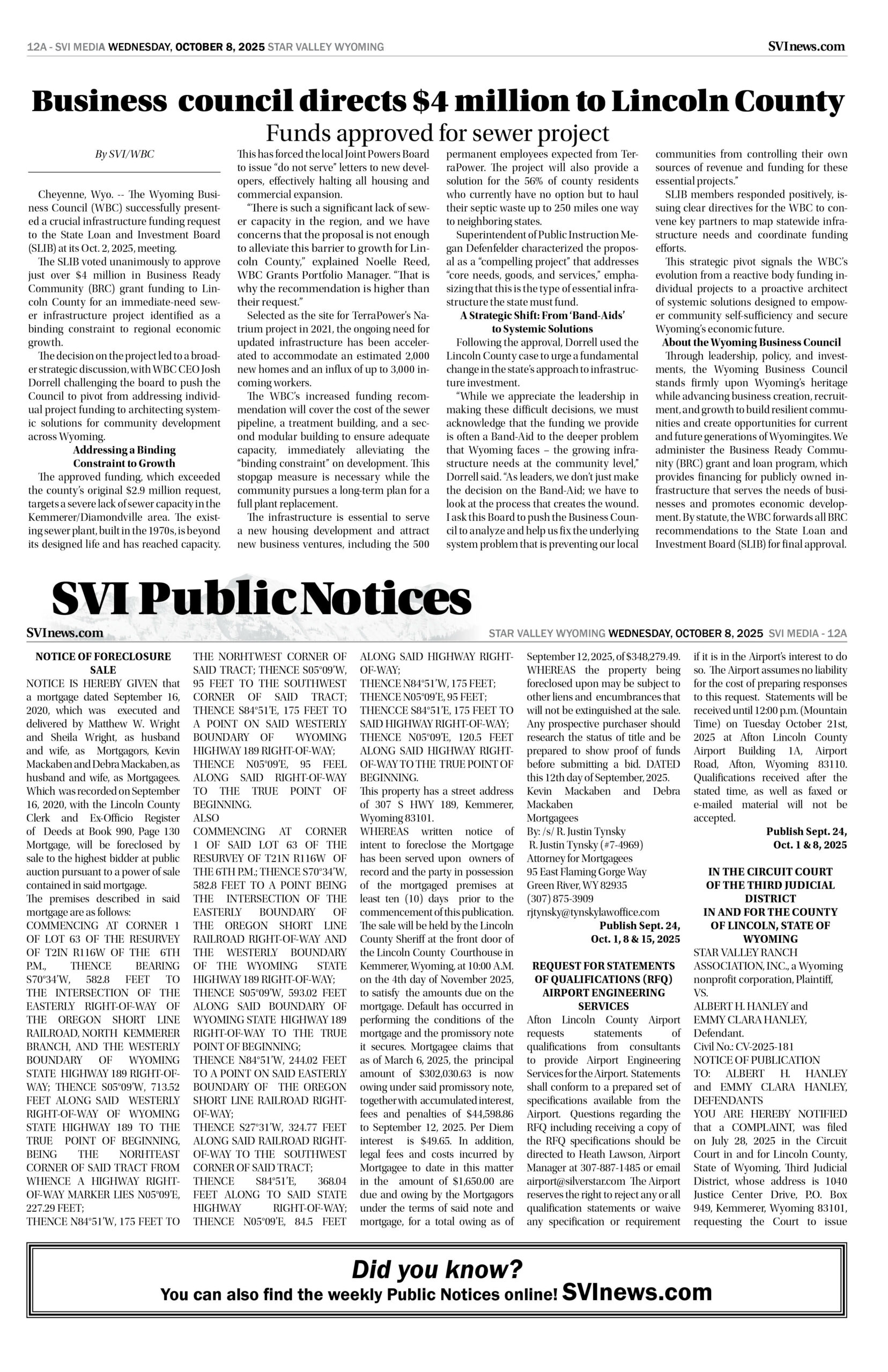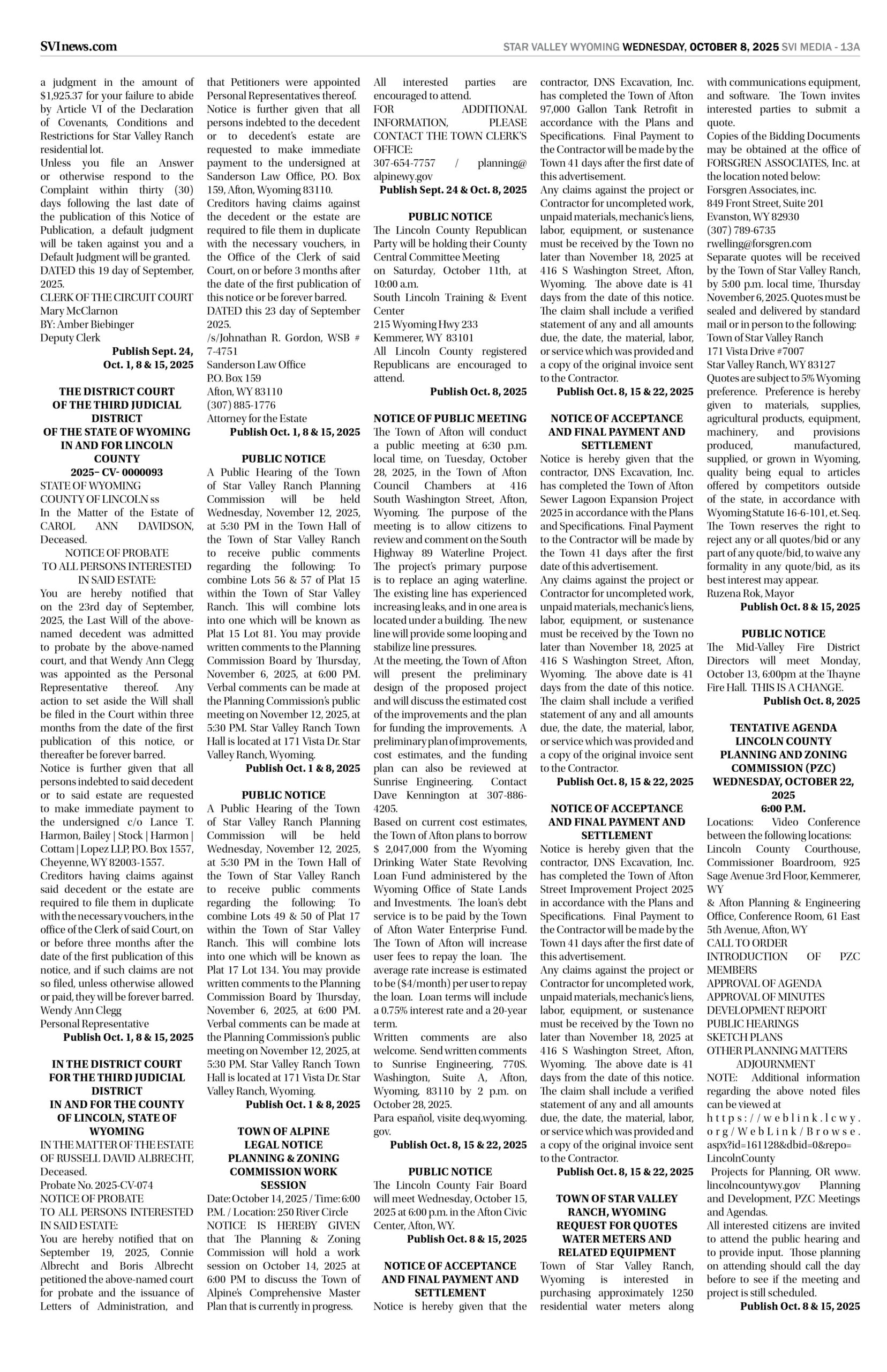 HomepagePublic NoticesOctober 8, 2025 Star Valley Independent Public Notices Public Notices October 8, 2025 Star Valley Independent Public Notices Amanda Nelson Posted on October 7, 2025 Post Views: 958 Let us know what you think! +1 0 +1 0 +1 0 +1 0 +1 0 +1 0 Post navigation Previous PostPokes in the Pros: Week 5 Next PostForest Service clears roads, fills holes near Smoot You Might Also Like Featured Cowboys Face Road Test at Sam HoustonĀ on Wednesday SVI Staff November 18, 2025 Sports (Video) – Star Valley Braves host Lander in 3A semifinals SVI Staff November 7, 2025 Featured Star Valley State Football Recap Show with Jake Hibbard Duke Dance November 21, 2025 Featured Rocky Mountain vs Pine Bluffs 1A 9-Man 2025 State Football Highlights Duke Dance November 17, 2025