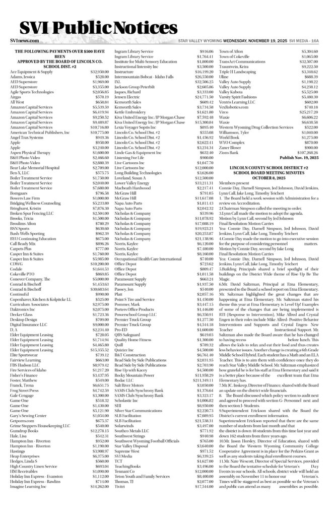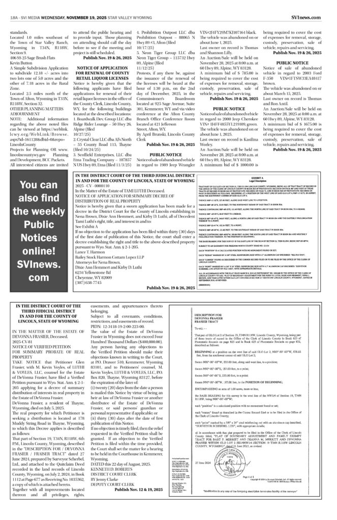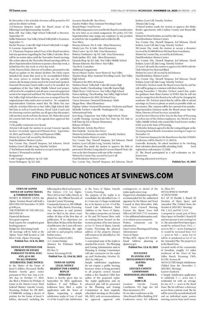 HomepagePublic NoticesNovember 19, 2025 Star Valley Independent Public Notices Public Notices November 19, 2025 Star Valley Independent Public Notices Aubrey Taylor Posted on November 18, 2025 Post Views: 428 Let us know what you think! +1 0 +1 0 +1 0 +1 0 +1 0 +1 0 Post navigation Previous PostAirport Improvements on Track in Kemmerer Next PostStar Valley Ranch man arrested on kidnapping charges You Might Also Like Featured Magic of Believing rolls into Afton Janet Erickson December 3, 2025 Featured (Video) – Bear Lake Boys Basketball vs West Jefferson Dahl Erickson December 4, 2025 Highlight Commissioners take no action on streaming meetings Duke Dance November 19, 2025 Featured (Photo Gallery) – Afton Parade of Lights SVI Staff December 2, 2025