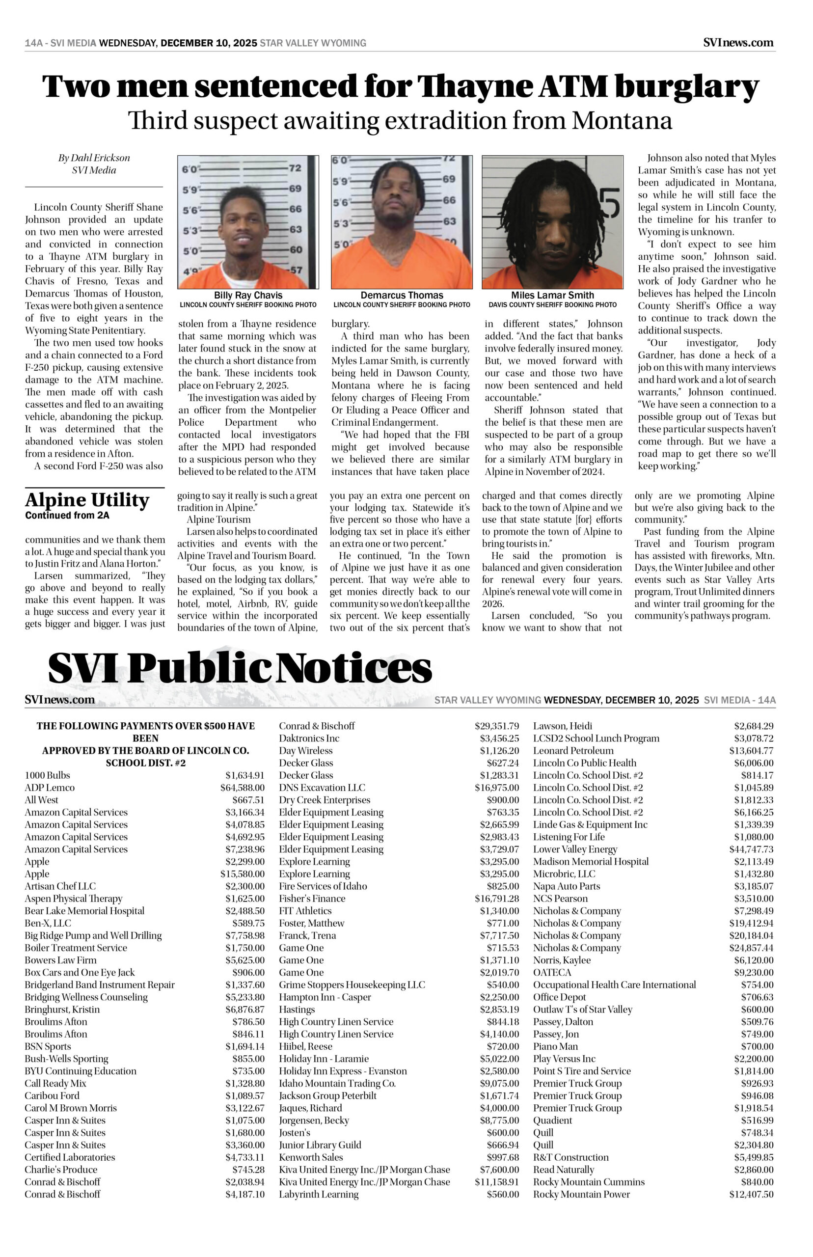 HomepagePublic NoticesDecember 10, 2025 Star Valley Independent Public Notices Public Notices December 10, 2025 Star Valley Independent Public Notices Amanda Nelson Posted on December 9, 2025 Post Views: 28 Let us know what you think! +1 0 +1 0 +1 0 +1 0 +1 0 +1 0 LEAVE A RESPONSE Cancel replyYou must be logged in to post a comment. Post navigation Previous PostStars in the Valley 2025 shines this Saturday You Might Also Like Featured Lummis leads push to rescind Public Lands Rule Wyoming News Exchange November 12, 2025 Featured Alpine brings second reading on Utility Rate Ordinance SVI Staff November 20, 2025 Regional News Turning Point’s Hall of Trees Fundraiser takes place this Thursday Aubrey Hale December 1, 2025 Radio The Wave Radio Interview: F. Ross Peterson – “Christmas In Montpelier” Duke Dance November 20, 2025