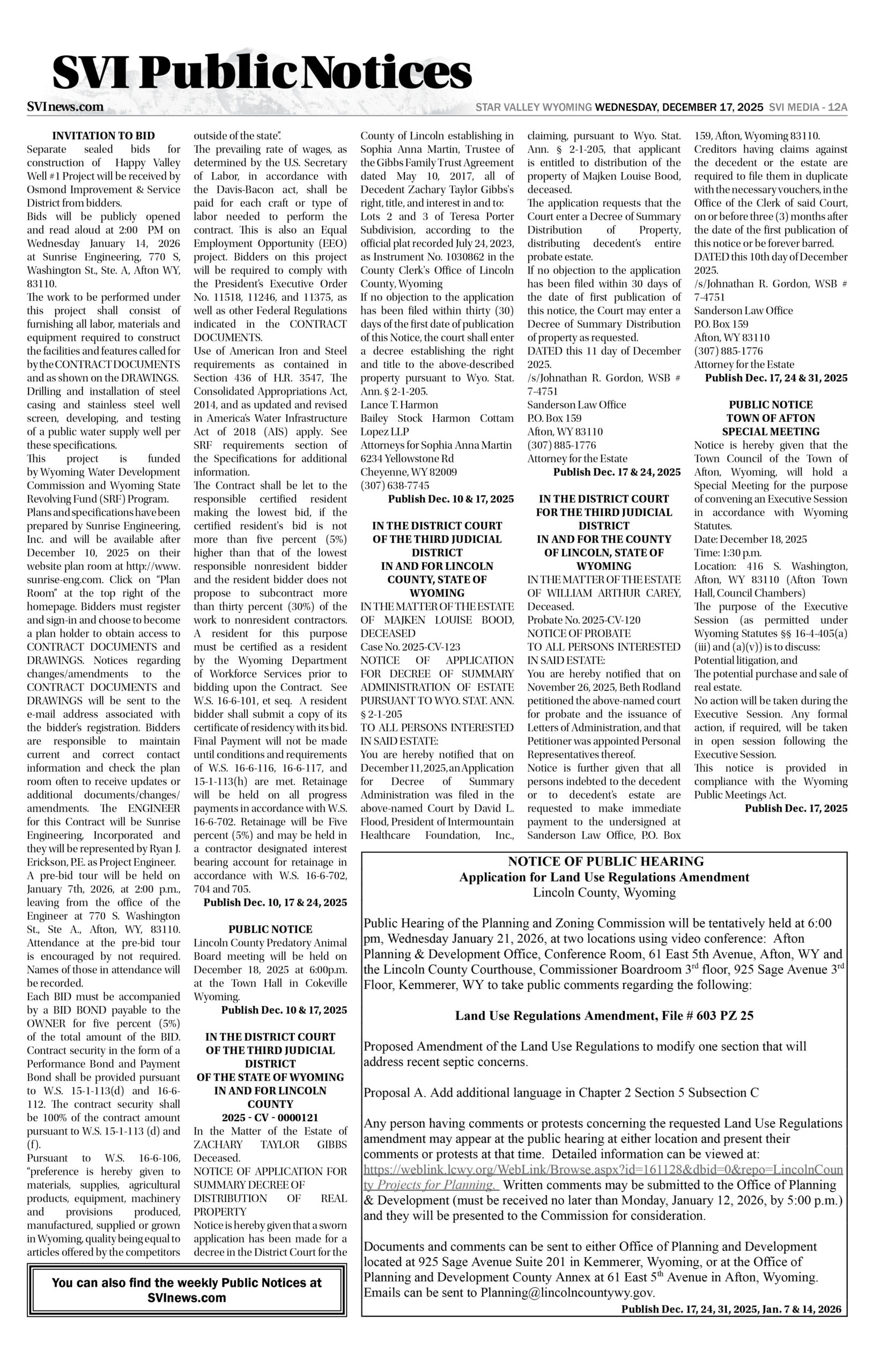 HomepagePublic NoticesDecember 17, 2025 Star Valley Independent Public Notices Public Notices December 17, 2025 Star Valley Independent Public Notices Amanda Nelson Posted on December 16, 2025 Post Views: 199 Let us know what you think! +1 0 +1 0 +1 0 +1 0 +1 0 +1 0 LEAVE A RESPONSE Cancel replyYou must be logged in to post a comment. Post navigation Previous PostGasoline prices down another 6.5 cents in Wyoming in the past week Next PostFundraisers support local family following shooting You Might Also Like Featured Free Thanksgiving Dinner is open to all Aubrey Taylor November 22, 2025 Interviews SVI Radio Interview: Dir. Angi Bruce, Wyoming Game & Fish Department Duke Dance December 2, 2025 Local News Braves open ’25-’26 campaign at TitleOne Tip-Off Dahl Erickson December 10, 2025 Featured Thayne Town Council Meeting Aubrey Hale November 27, 2025