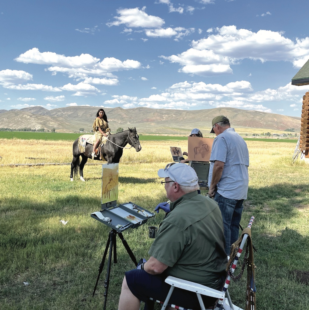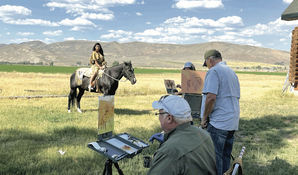 Attendees explored key elements of Western art including: horses, figures, and the Wyoming landscape—through direct observation and practice. The workshop featured demonstrations and instruction by Cowboy Artists of America members, Grant Redden and Chad Poppleton. Participants also had the opportunity to photograph models from the Fort Hall Reservation, mountain man reenactors, and regional cowboys. Local models, Kiana, Peyton and River Gilmore were also painted.