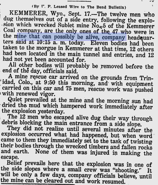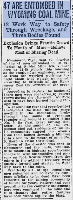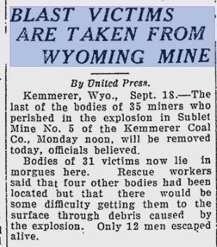 Kemmerer, Wyo., Sept. 17. – Rescue workers gave their opinion Wednesday night that the explosion in the Kemmerer Coal Company’s mine at Sublet, near here, Tuesday, took a toll on thirty-nine lives.