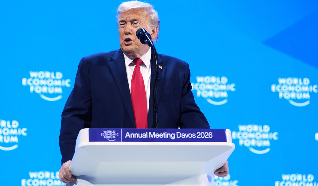 President Donald Trump addresses the audience during the Annual Meeting of the World Economic Forum in Davos, Switzerland, Wednesday, Jan. 21, 2026. (AP Photo/Evan Vucci)