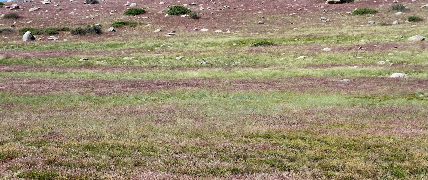 Cheatgrass grows where reddish stripes appear on the hillsides leading up to Washakie Reservoir in June 2024. The green stripes are where an herbicide, Rejuvra, was experimentally applied. (Mike Koshmrl/WyoFile)