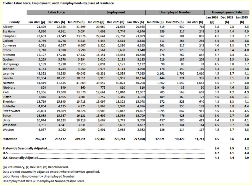 CHEYENNE (WNE) — The state’s seasonally adjusted unemployment rate rose from 3.5% in December 2025 to 3.6% in January 2026, according to the Research and Planning Section of the Wyoming Department of Workforce Services.