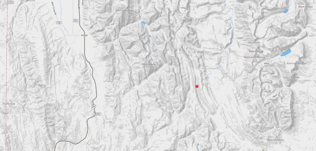 The red dot indicates the location of the avalanche that occurred Sunday afternoon above LaBarge Creek, claiming the life of one snowmobiler.