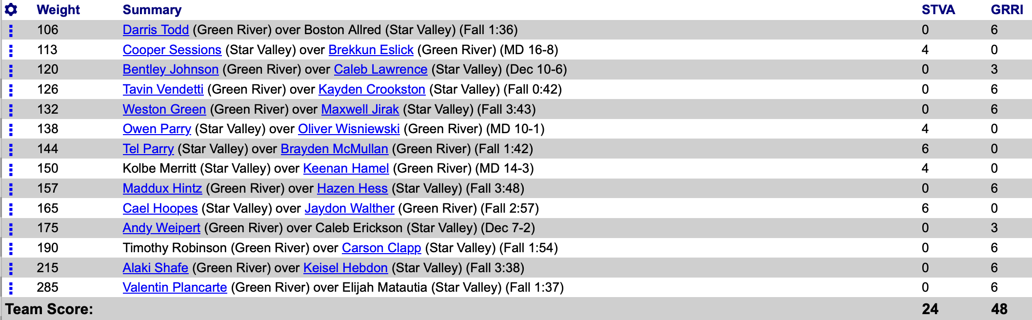 The Star Valley Braves hosted both the Jackson Broncs and the Green River Wolves on Tuesday night as part of Senior Night and a triangular event. Most of the matches with the Broncs were considered an exhibition in an afternoon start. Star Valley fell to the Wolves in a dual to close out the evening 48-24.