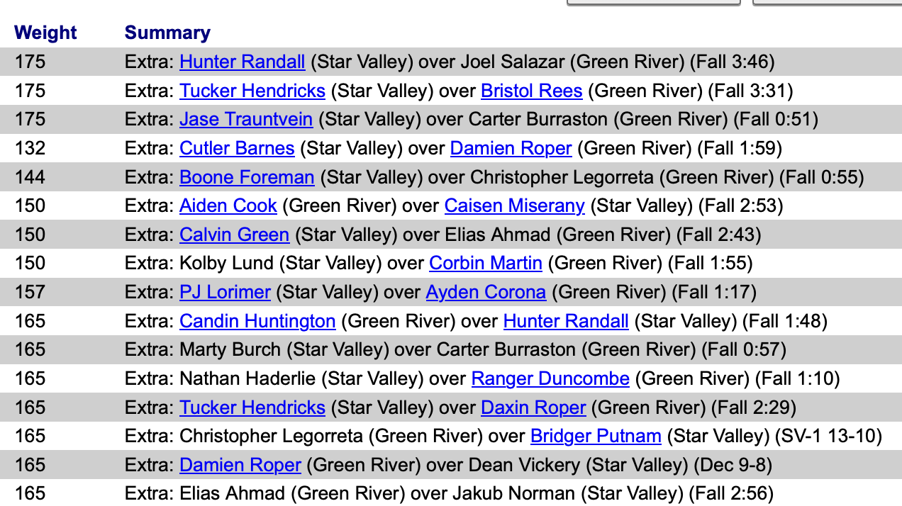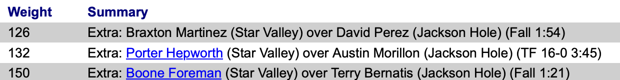 Below the bout sheets from Tuesday is a recap of Star Valley’s efforts at the Ron Thon Memorial in Riverton last weekend as well as a photo gallery of Tuesday night. To purchase high resolution images from the gallery, CLICK HERE.