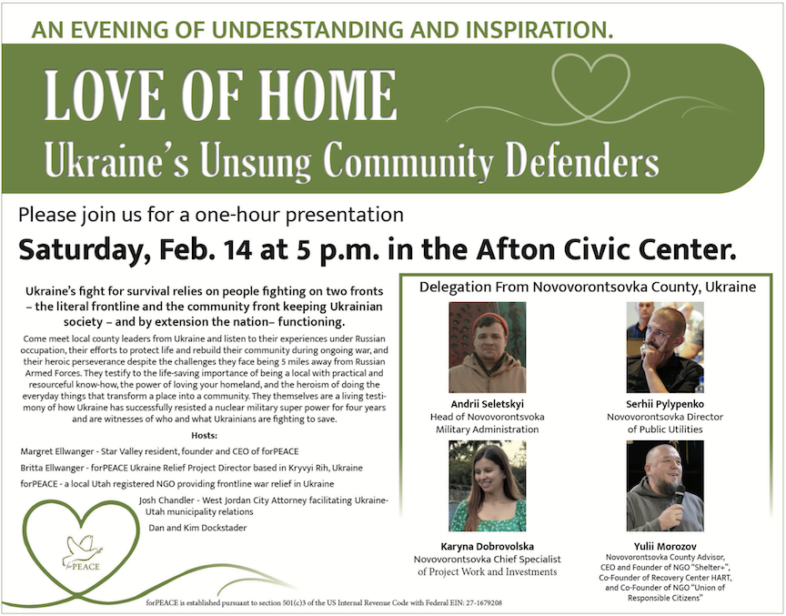 Have you ever met someone and thought, “I am in the presence of greatness!” Recently we had the opportunity of meeting the Ellwanger family who call both Star Valley and Israel home. Russell is the CEO of Tower Semiconductor, and Margret is the founder and CEO of ForPeace, a nonprofit organization that provides integrated war relief for Ukraine as well as other humanitarian projects throughout the world. After spending a few hours with them and their daughter Britta, who is the Ukraine Relief Project Director with ForPeace, we came away in awe of what they are doing and what they are trying to do to make our world a better place. We asked them how we could help, and they mentioned they were bringing a delegation from Ukraine to Utah and Idaho in February, and wondered if our community  might be interested in having an informative discussion with these Ukrainian community leaders.