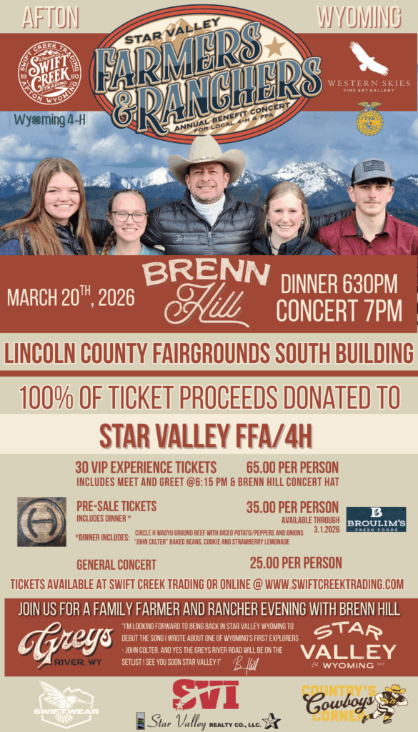 Tickets for the event are available at SwiftCreekTrading.com. Presale for discounted tickets ends March 1. 100% of proceeds benefit the Star Valley FFA and 4-H.