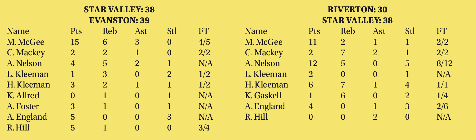 The Lady Braves trailed for most of the game, but eventually cut what was once a double-digit deficit into a single possession. Late in the game, Star Valley took a one-point lead with under a minute to go before Evanston’s Emma Lonsway put in the eventual game-winner on a runner off the glass. Star Valley had a chance for a shot with under five seconds to go but were unable to get a shot off. Morgan McGee led the team with 15 points. Avery England and Ruby Hill each chipped in five.