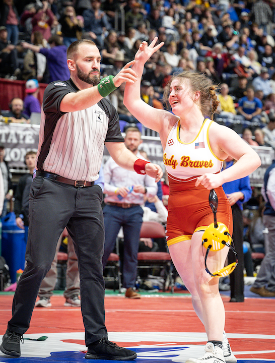 The Lady Braves led wire to wire at the Wyoming State Wrestling Championships as they claimed their fourth straight team title with a total of 167.5 team points. Green River was second with 110.5 and Powell was third with 100.5.