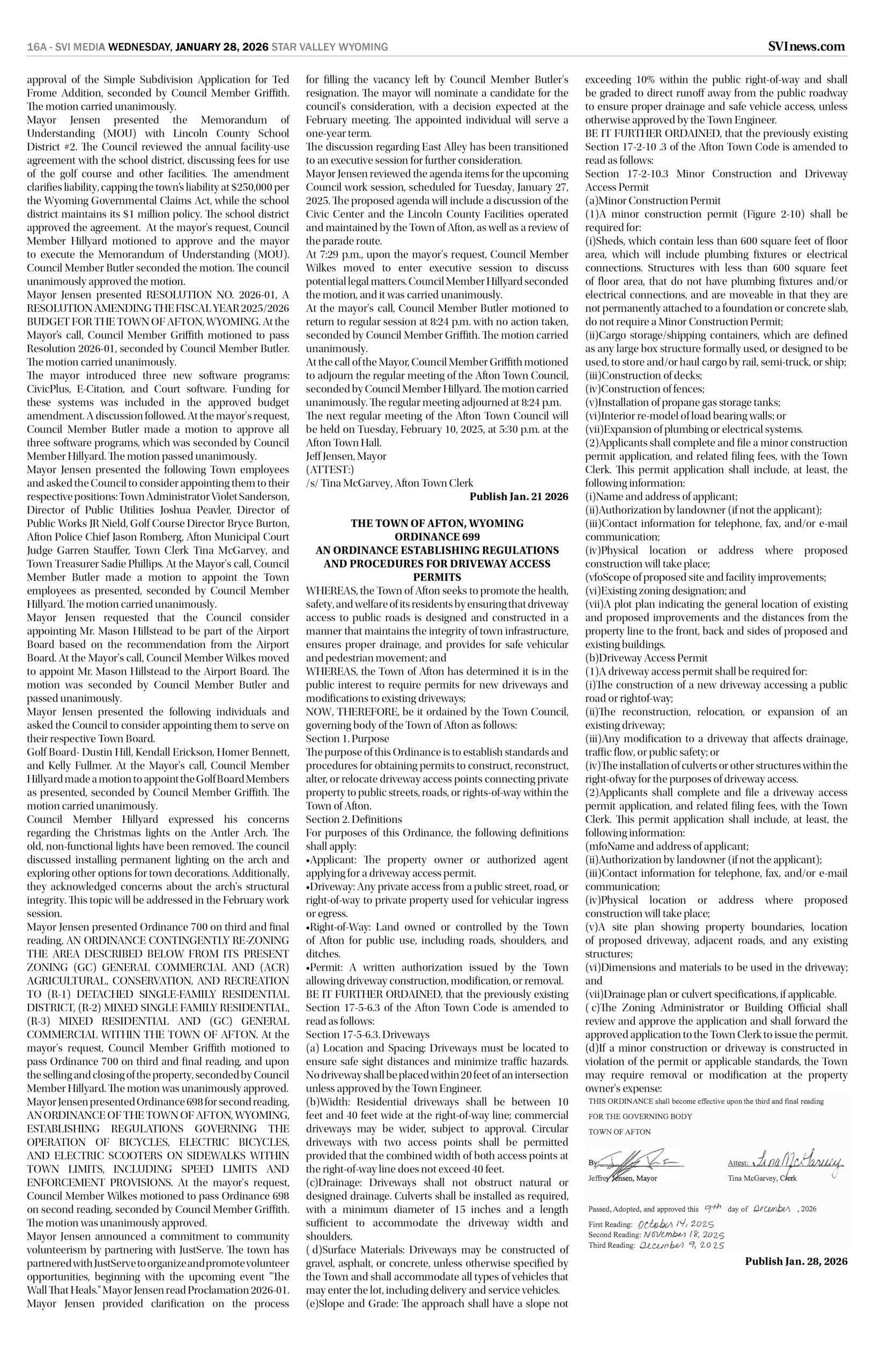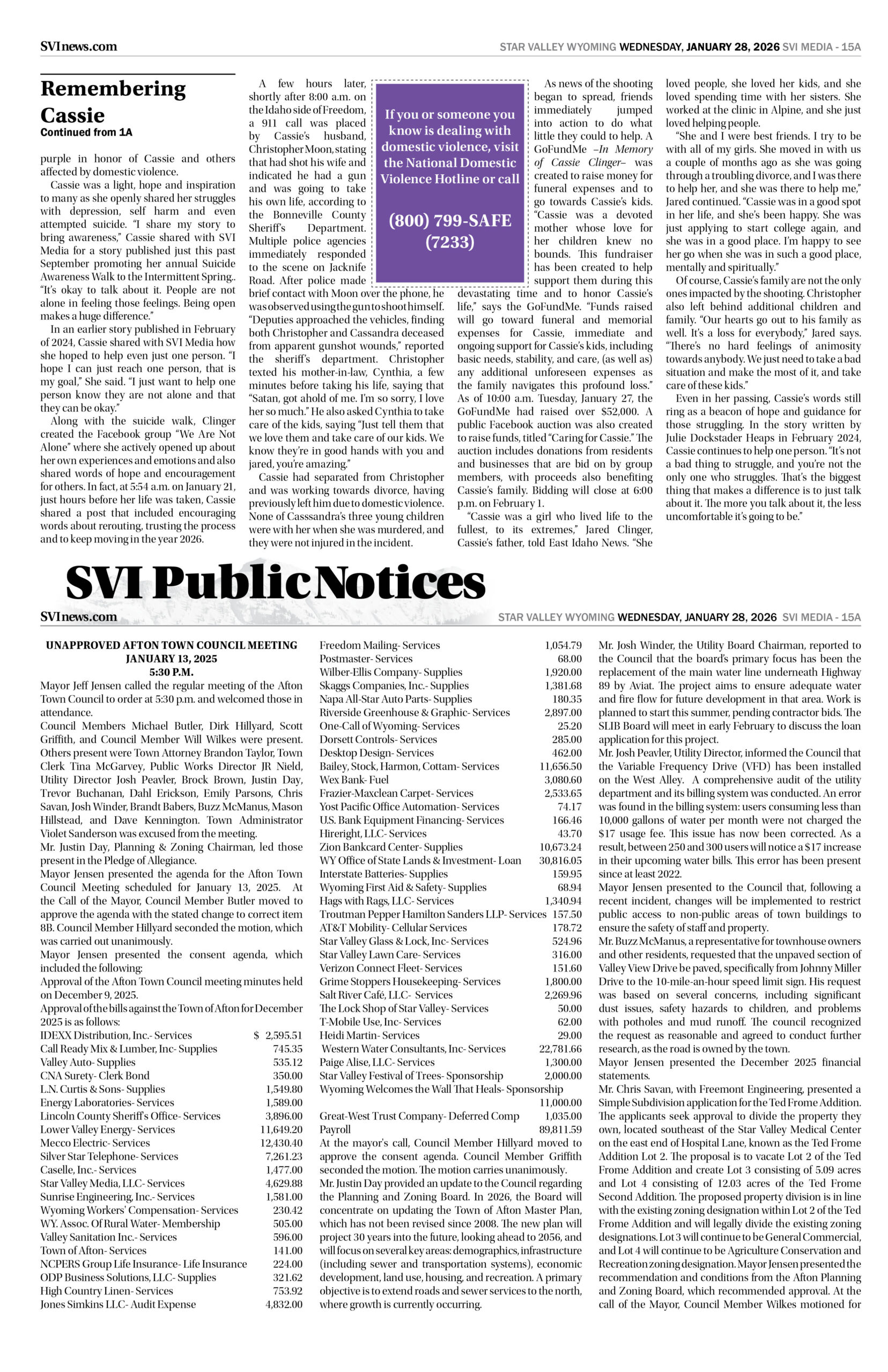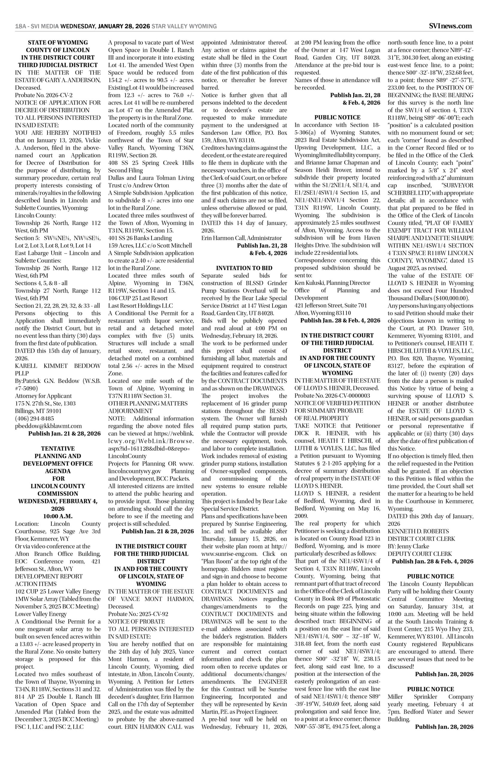 HomepagePublic NoticesJanuary 28, 2026 Star Valley Independent Public Notices Public Notices January 28, 2026 Star Valley Independent Public Notices Amanda Nelson Posted on January 27, 2026 Post Views: 70 Let us know what you think! +1 0 +1 0 +1 0 +1 0 +1 0 +1 0 LEAVE A RESPONSE Cancel replyYou must be logged in to post a comment. Post navigation Previous PostSVI Radio Interview: LCSD#2 Superintendent Matt Erickson Next PostRemembering Cassie: Star Valley rallies following shocking murder-suicide You Might Also Like Featured BYU’s Young Ambassadors dance into town Saturday Janet Erickson January 15, 2026 Regional News Federal officer charged with murder following Lander bar fight Wyoming News Exchange January 19, 2026 Featured Judges needed for weekend tournament Aubrey Taylor January 21, 2026 Featured Sublette County attorney slams Cody Roberts’ motion to dismiss felony animal cruelty case Wyoming News Exchange January 8, 2026
