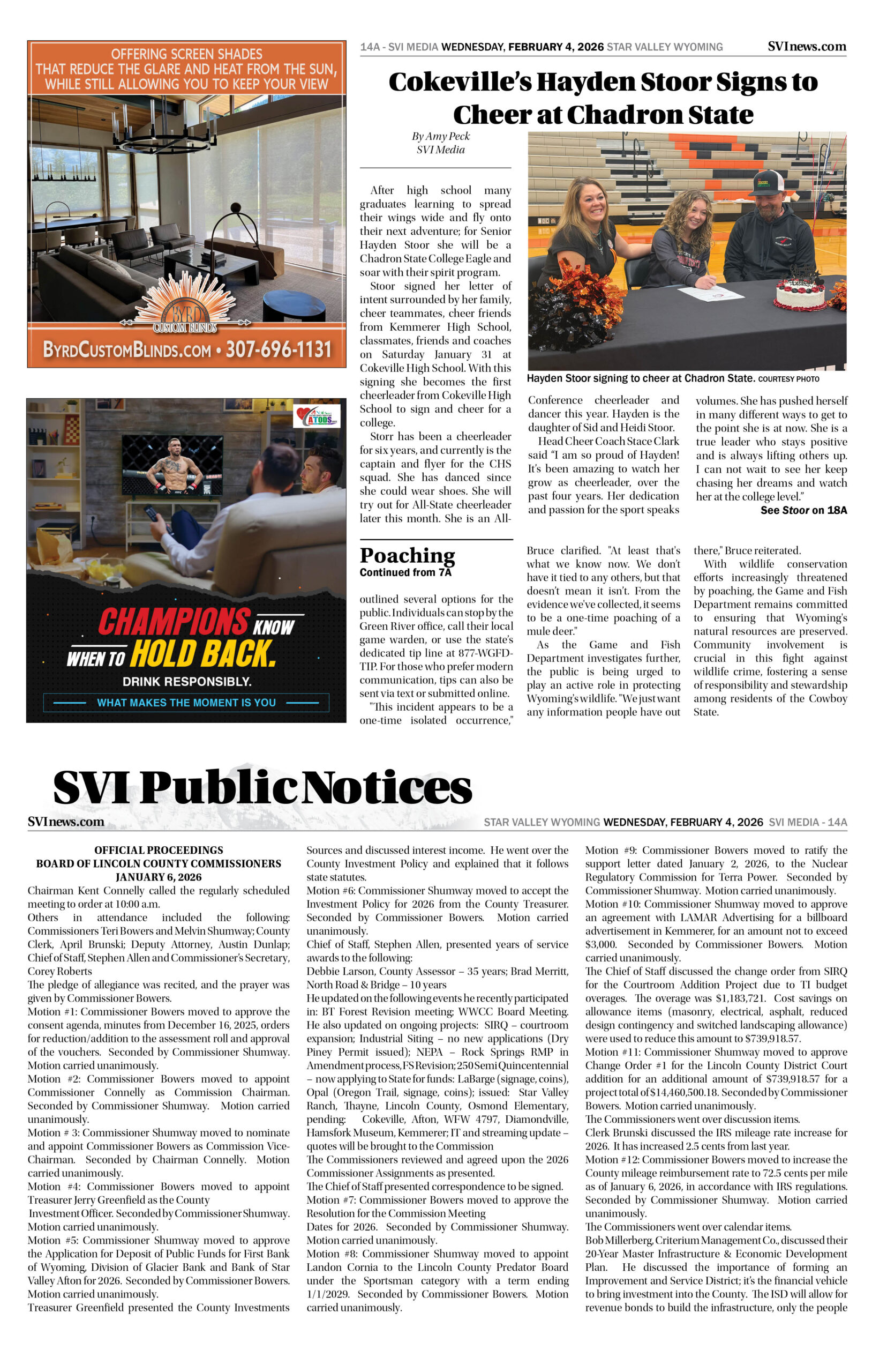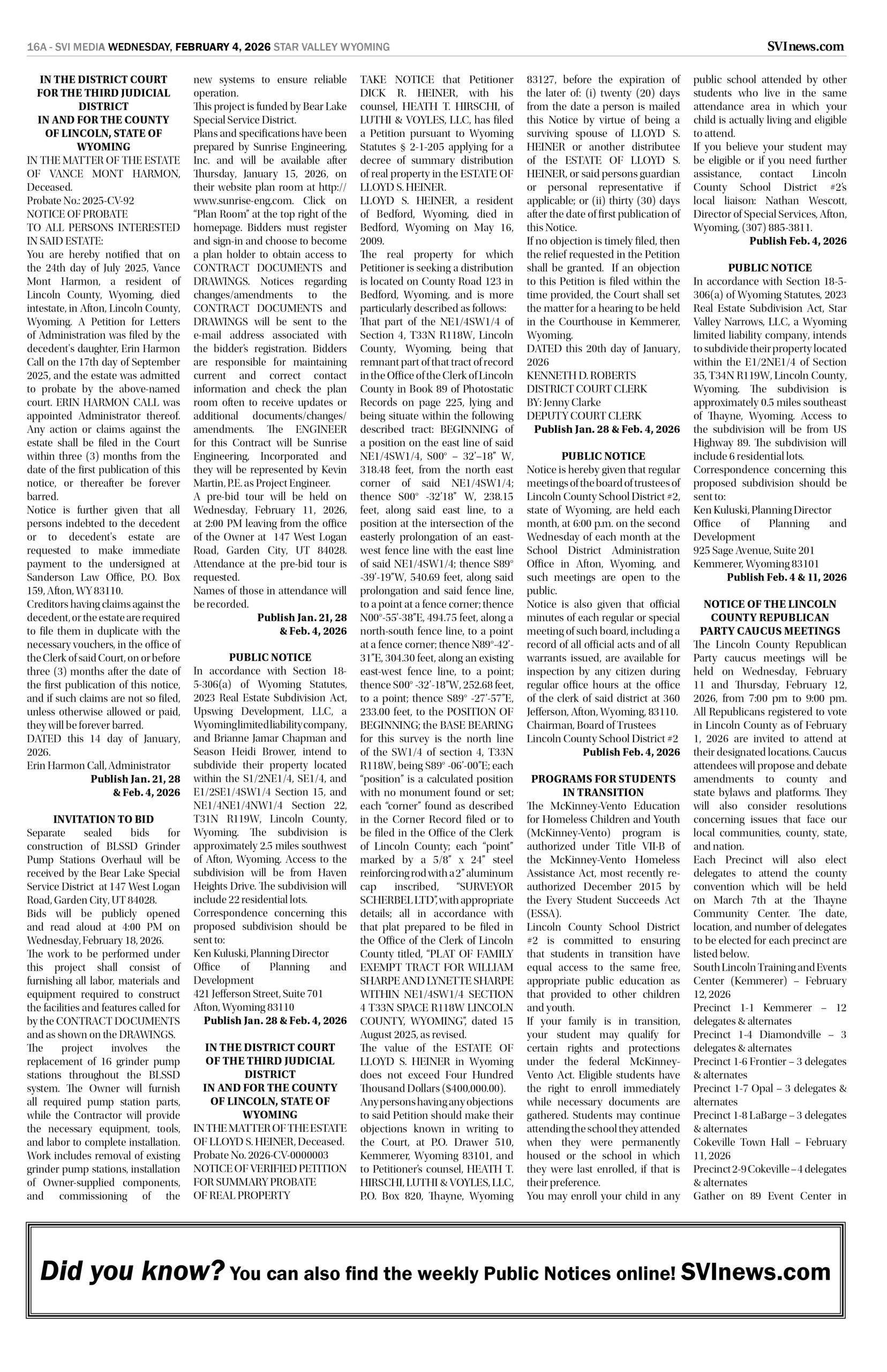 HomepagePublic NoticesFebruary 4, 2026 Star Valley Independent Public Notices Public Notices February 4, 2026 Star Valley Independent Public Notices Amanda Nelson Posted on February 3, 2026 Post Views: 96 Let us know what you think! +1 0 +1 0 +1 0 +1 0 +1 0 +1 0 LEAVE A RESPONSE Cancel replyYou must be logged in to post a comment. Post navigation Previous Post(Video) – Star Valley Wrestling vs Green River Next PostFree07 hosts 2026 fundraisers Saturday You Might Also Like Radio The Wave Radio Interview: Representative Josh Wheeler (R) Duke Dance January 28, 2026 Local News Governor Gordon Announces Final Round of Awardees for Semiquincentennial Grant Program SVI Staff January 15, 2026 Featured Sports Friday Interview: KSL’s Jeremiah Jensen Duke Dance January 9, 2026 Regional News 2026 Southwest Regional Science Fair hosted by Western Wyoming Community College SVI Staff January 29, 2026