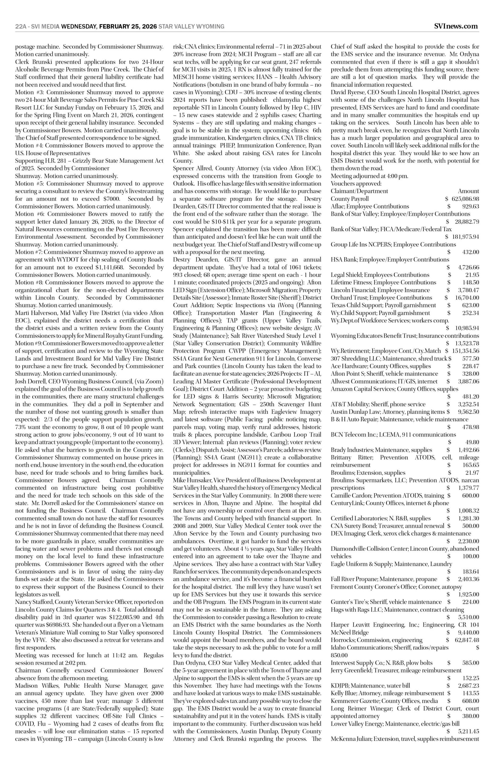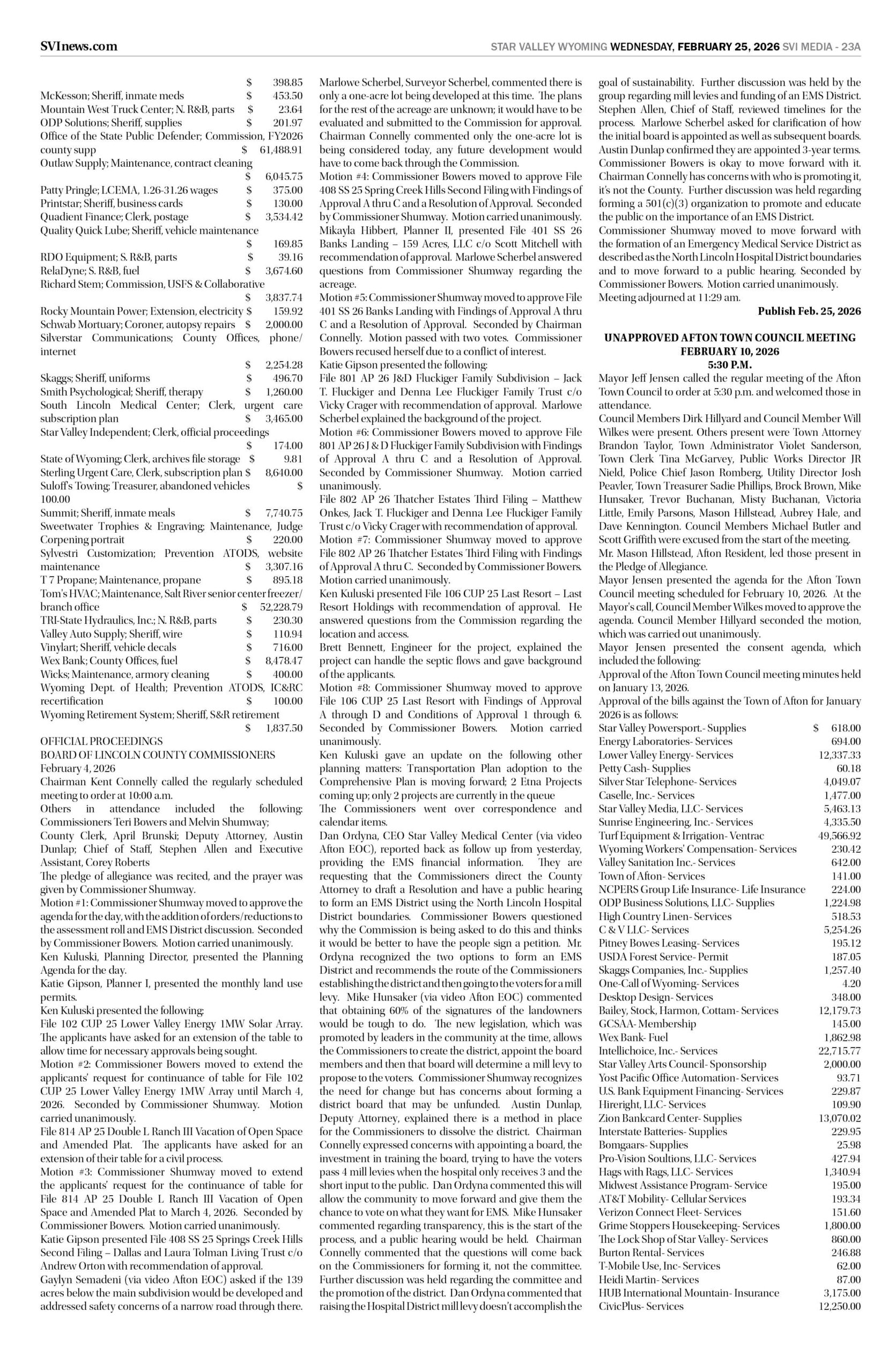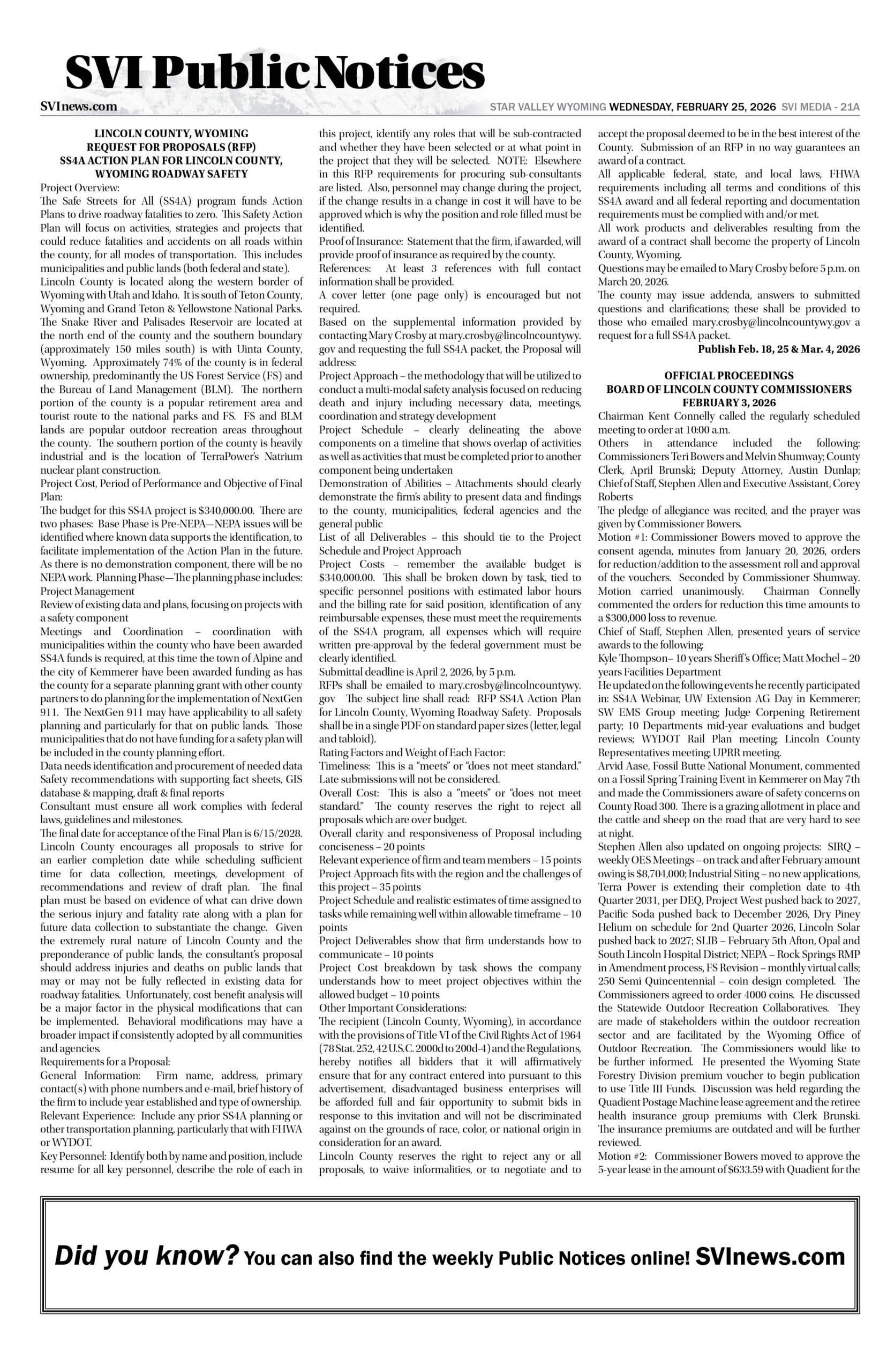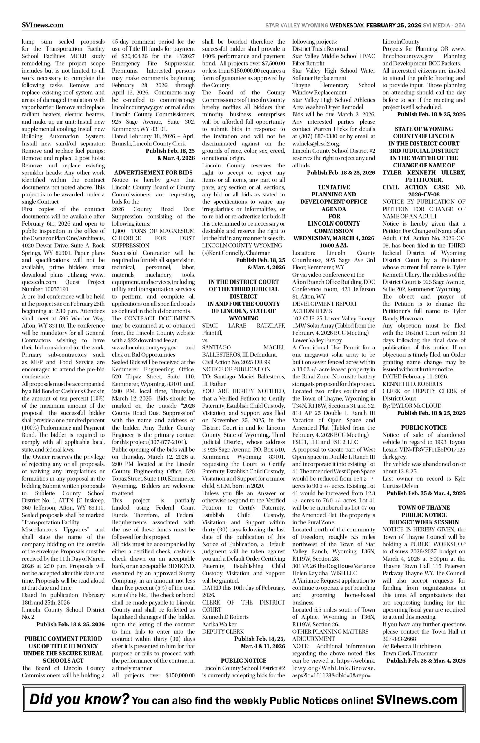 HomepagePublic NoticesFebruary 25, 2026 Star Valley Independent Public Notices Public Notices February 25, 2026 Star Valley Independent Public Notices Amanda Nelson Posted on February 24, 2026 Post Views: 85 Let us know what you think! +1 0 +1 0 +1 0 +1 0 +1 0 +1 0 LEAVE A RESPONSE Cancel replyYou must be logged in to post a comment. Post navigation Previous PostFairview house fire contained to bathroom/bedroom Next PostWyoming’s Congressional Delegation respond to President Trumps State of the Union Address You Might Also Like Featured Watch Live – Gov. Mark Gordon’s State of the State Address Duke Dance February 9, 2026 Sports (Video) – Bear Lake Boys host American Falls SVI Staff February 11, 2026 Sports (Video) Star Valley Boys Wrestling Duels in Cheyenne Duke Dance February 6, 2026 Featured (Video) – SVHS Wrestling at Evanston SVI Staff February 13, 2026