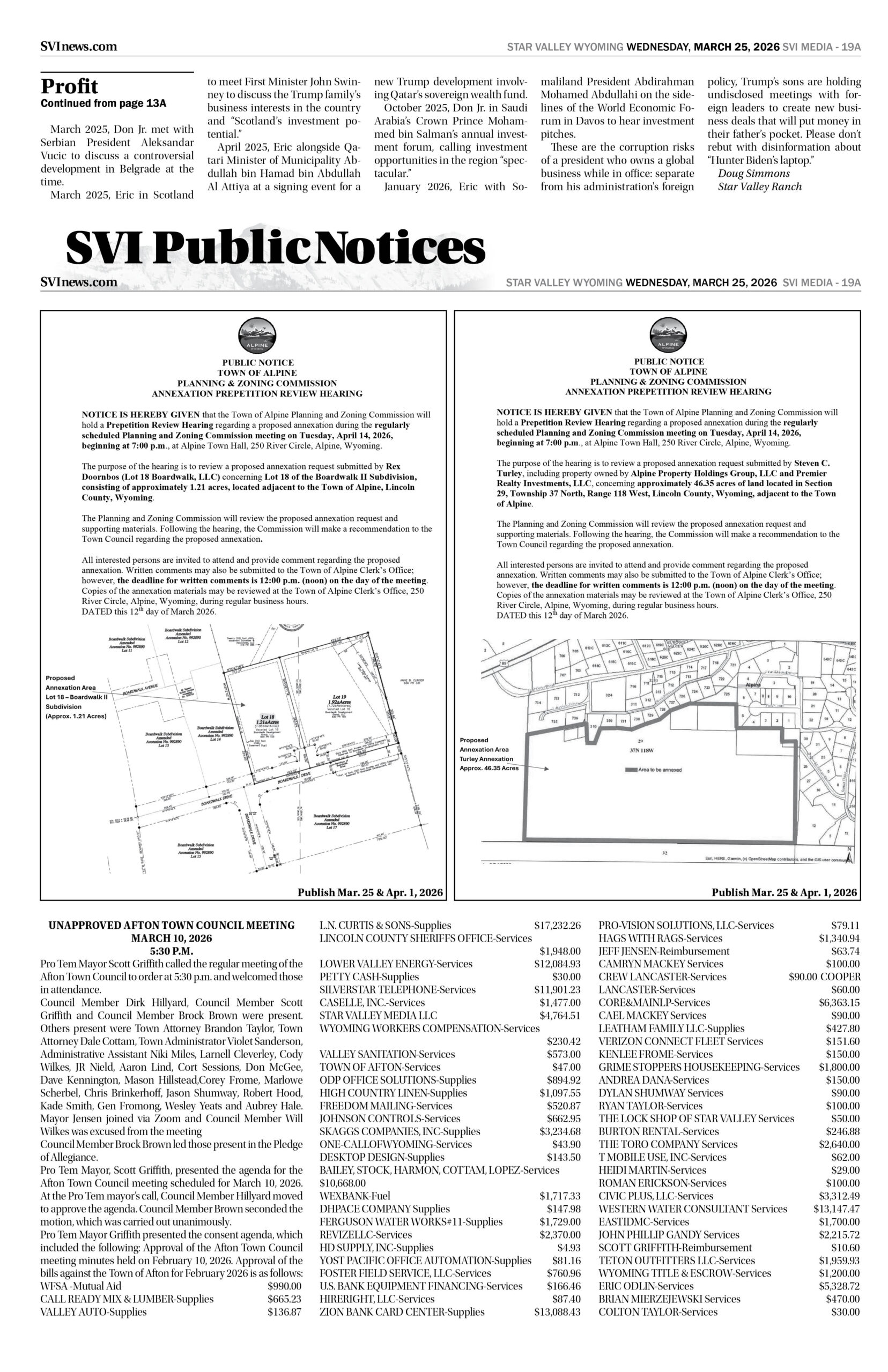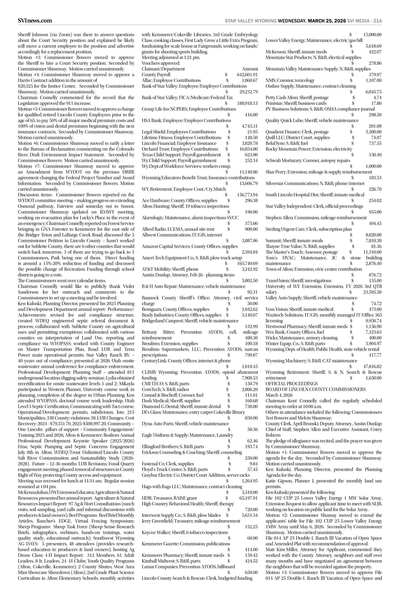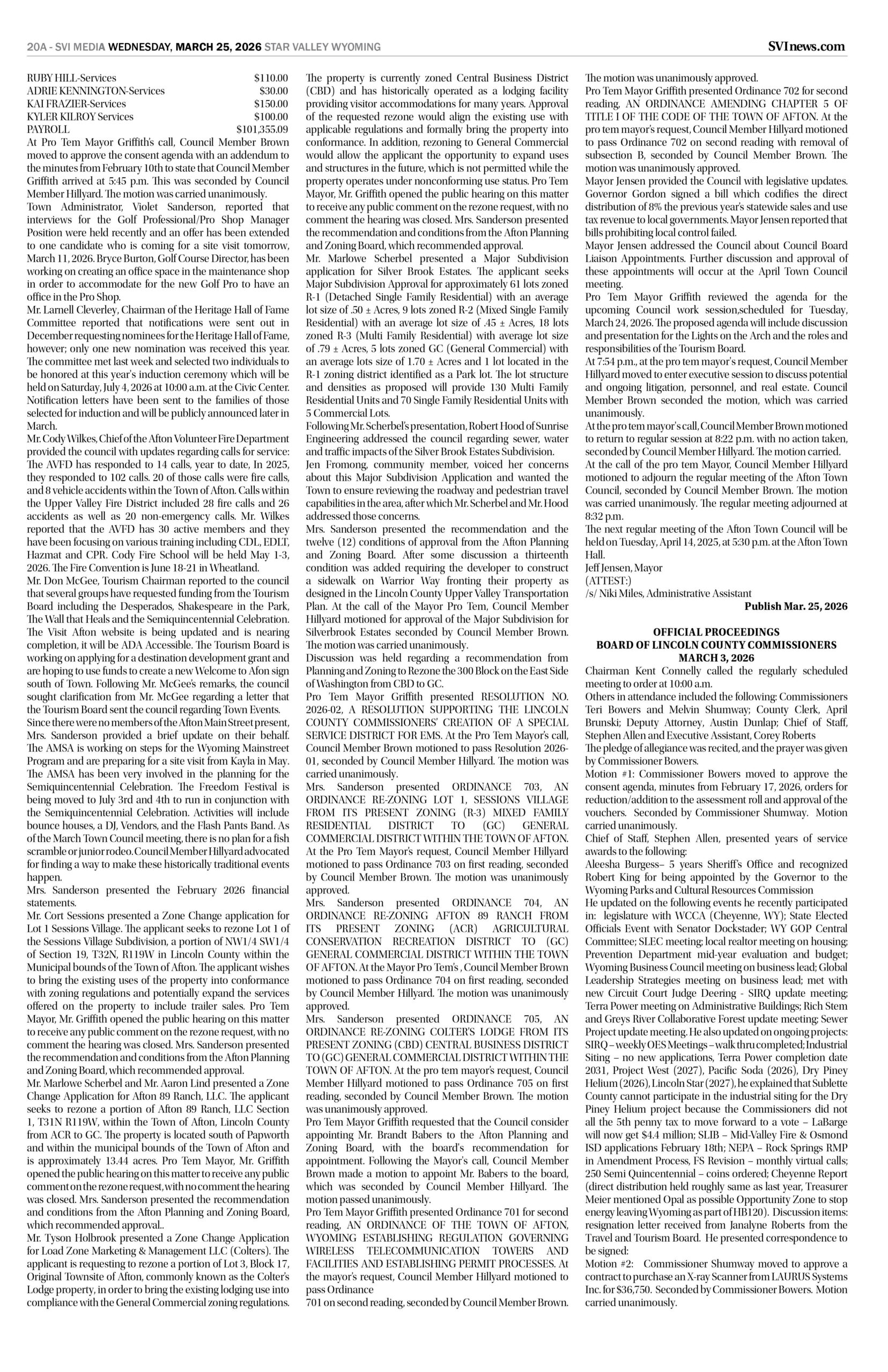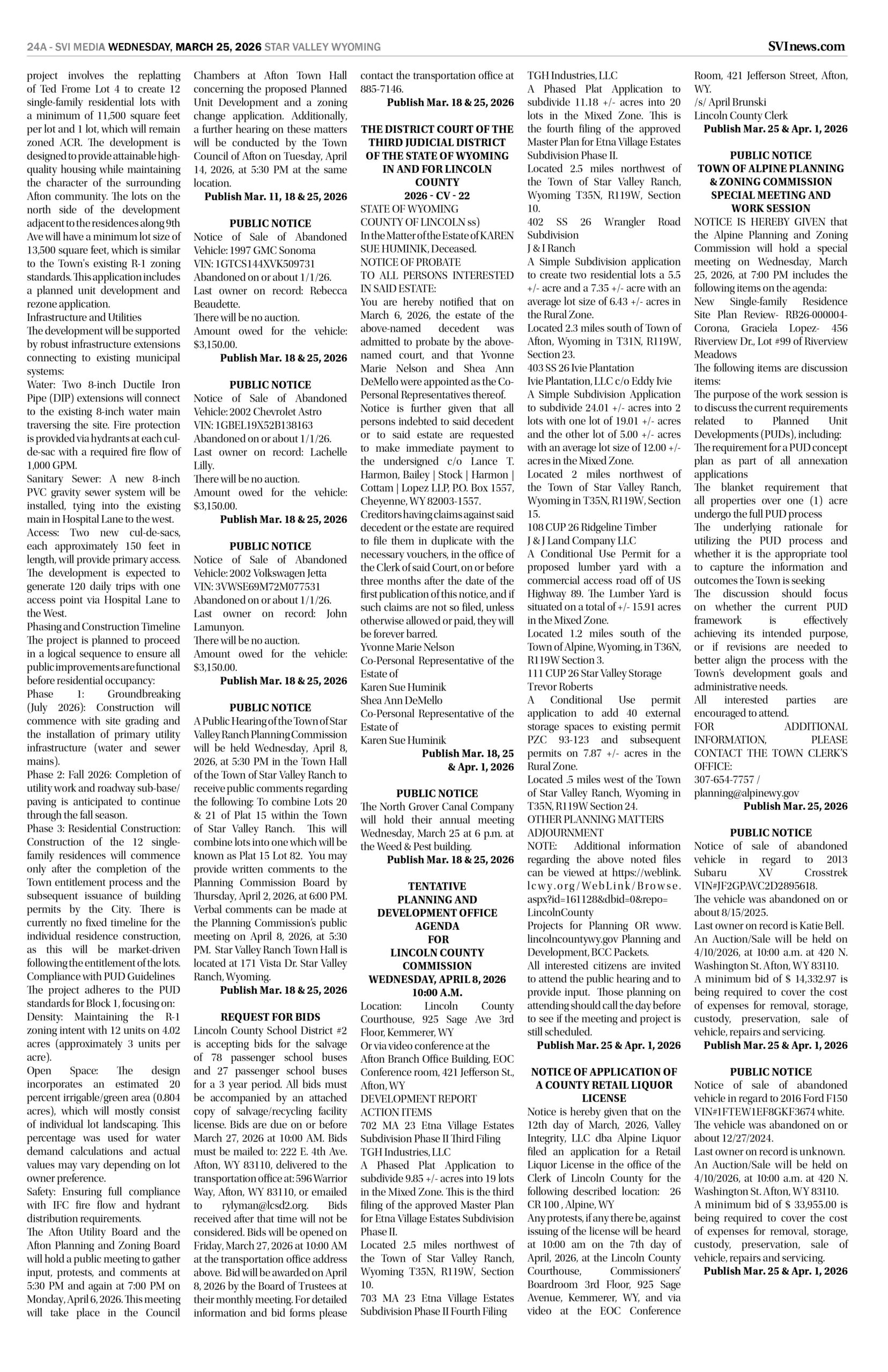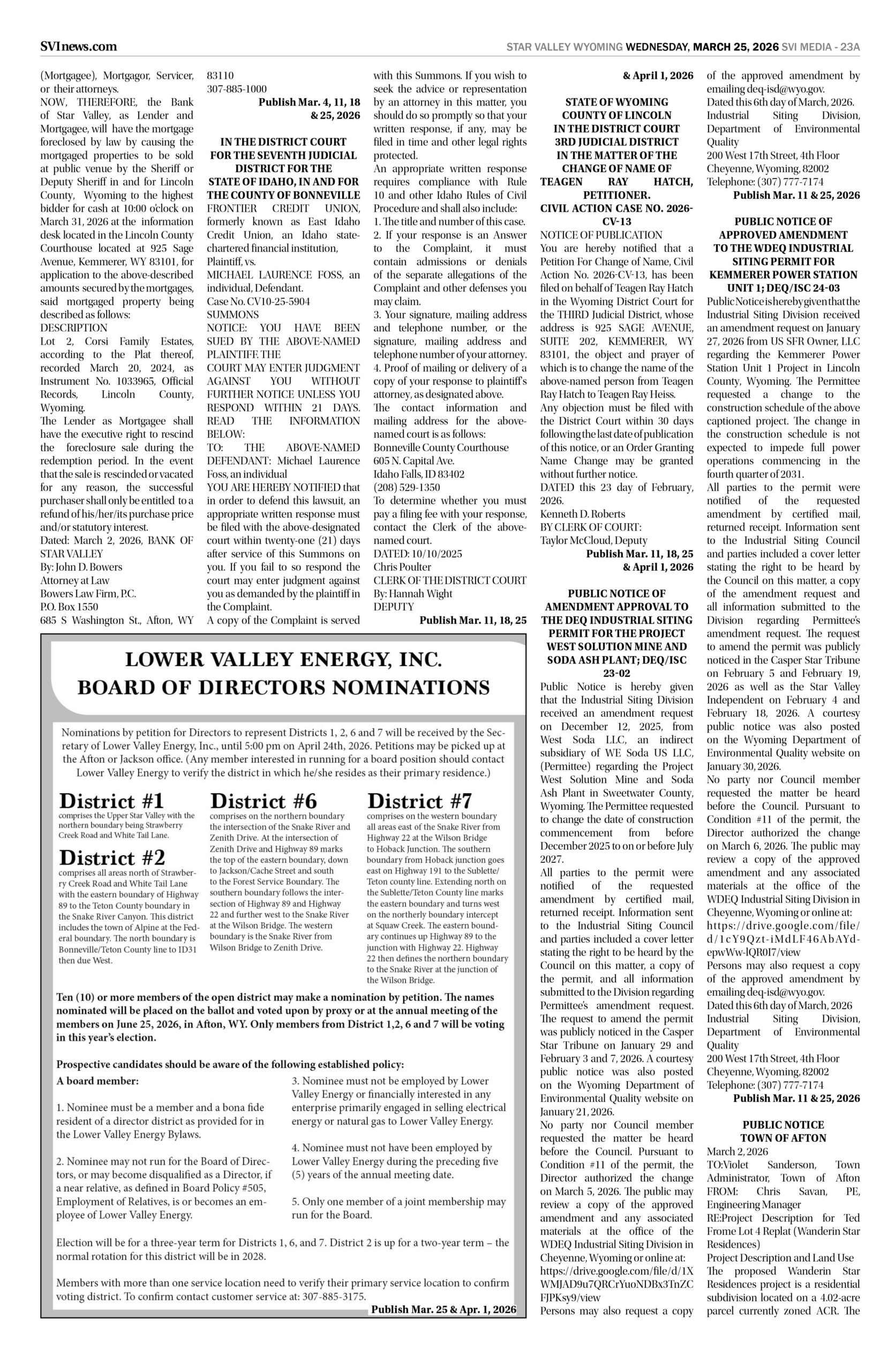 HomepagePublic NoticesMarch 25, 2026 Star Valley Independent Public Notices Public Notices March 25, 2026 Star Valley Independent Public Notices Amanda Nelson Posted on March 24, 2026 Post Views: 66 Let us know what you think! +1 0 +1 0 +1 0 +1 0 +1 0 +1 0 LEAVE A RESPONSE Cancel replyYou must be logged in to post a comment. Post navigation Previous PostWyoming’s average gasoline prices rise another 24 cents in past week Next PostAlpine addresses recreational fires, fireworks and new administrator You Might Also Like Interviews SVI Radio Interview: Bud Scheller and Liz Holtgreve – Wall That Heals report Duke Dance March 17, 2026 Regional News Work underway on Kemmerer South Wildlife crossings project SVI Staff March 23, 2026 Regional News WYDOT returns to finish work on the Green River tunnel Wyoming News Exchange March 18, 2026 Featured SVHS presents “Joseph and the Amazing Technicolor Dreamcoat” Janet Erickson March 19, 2026