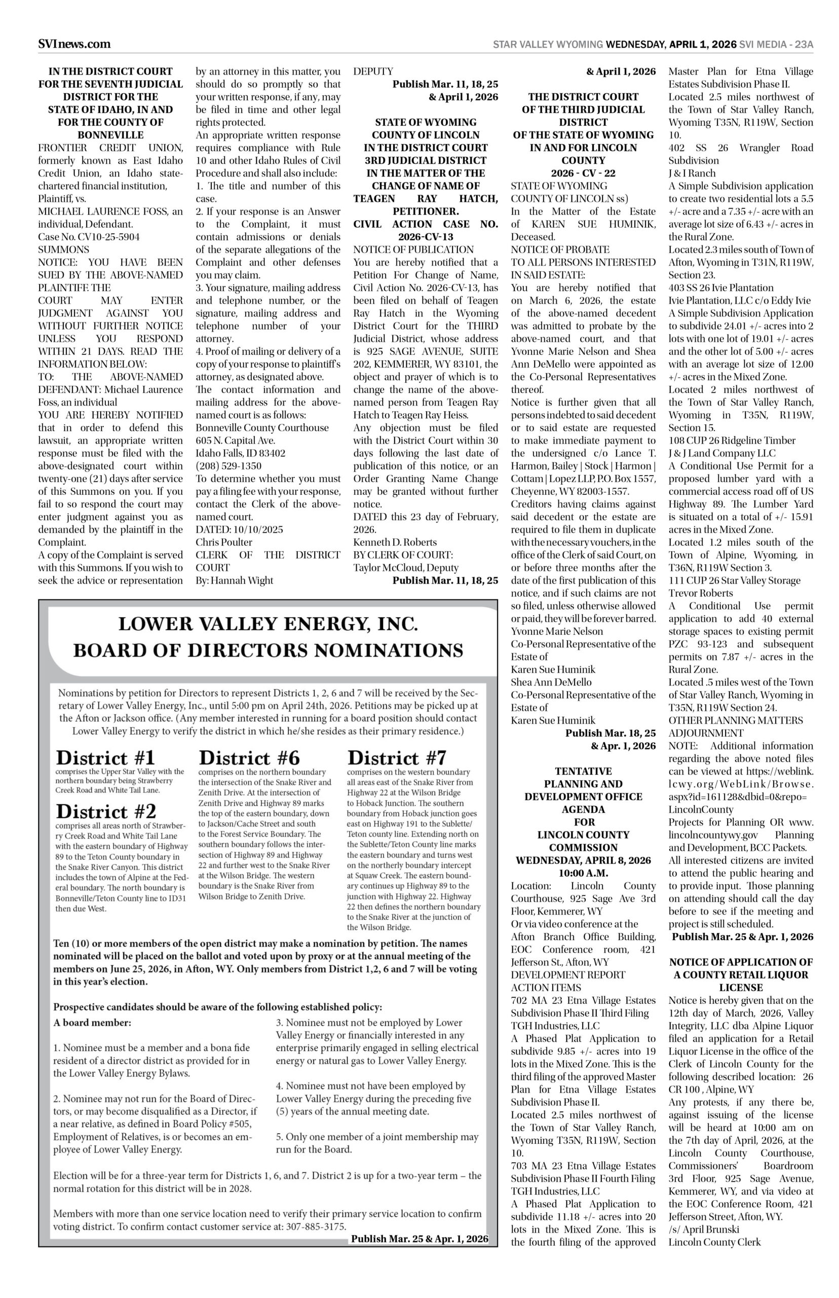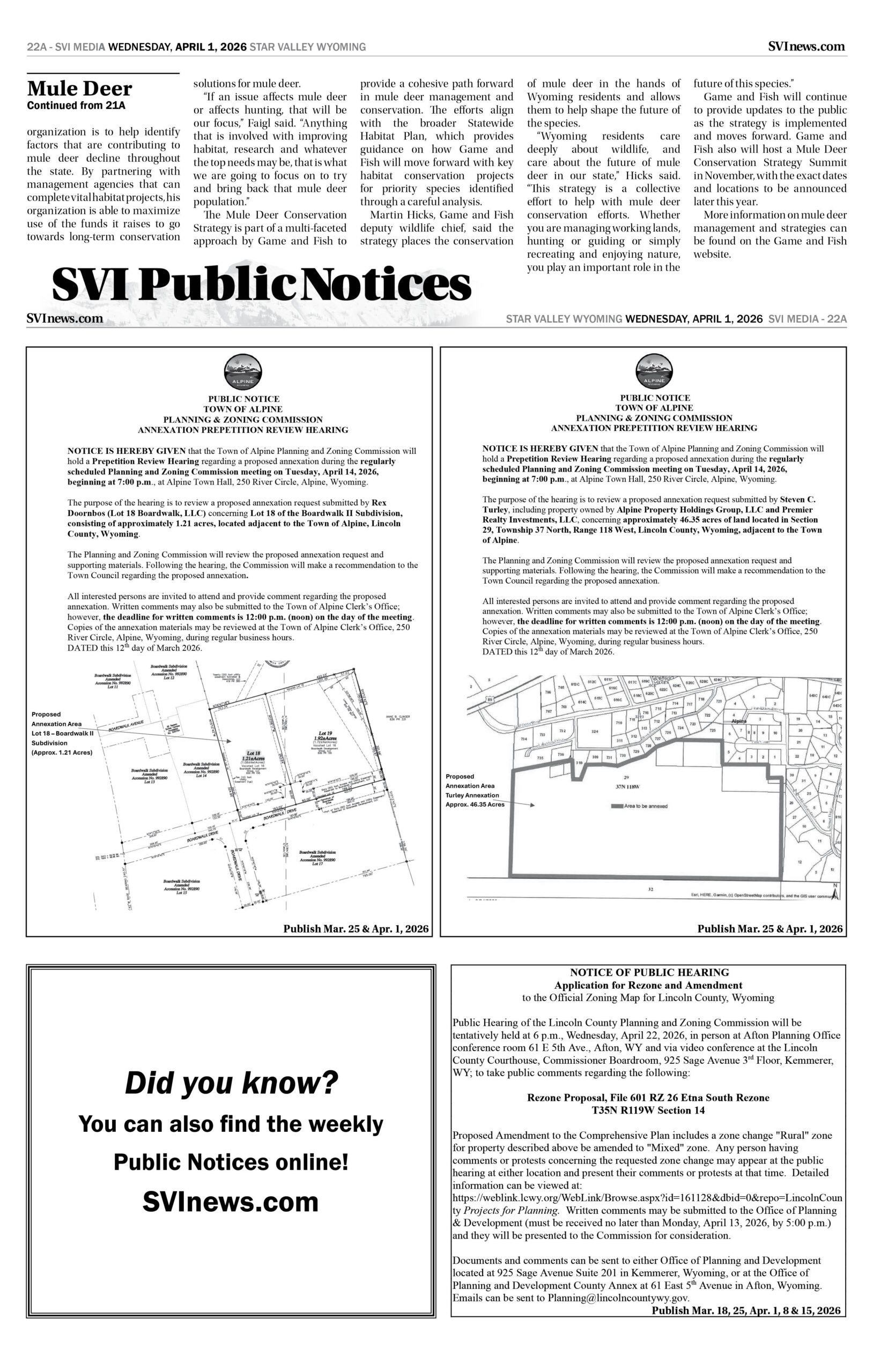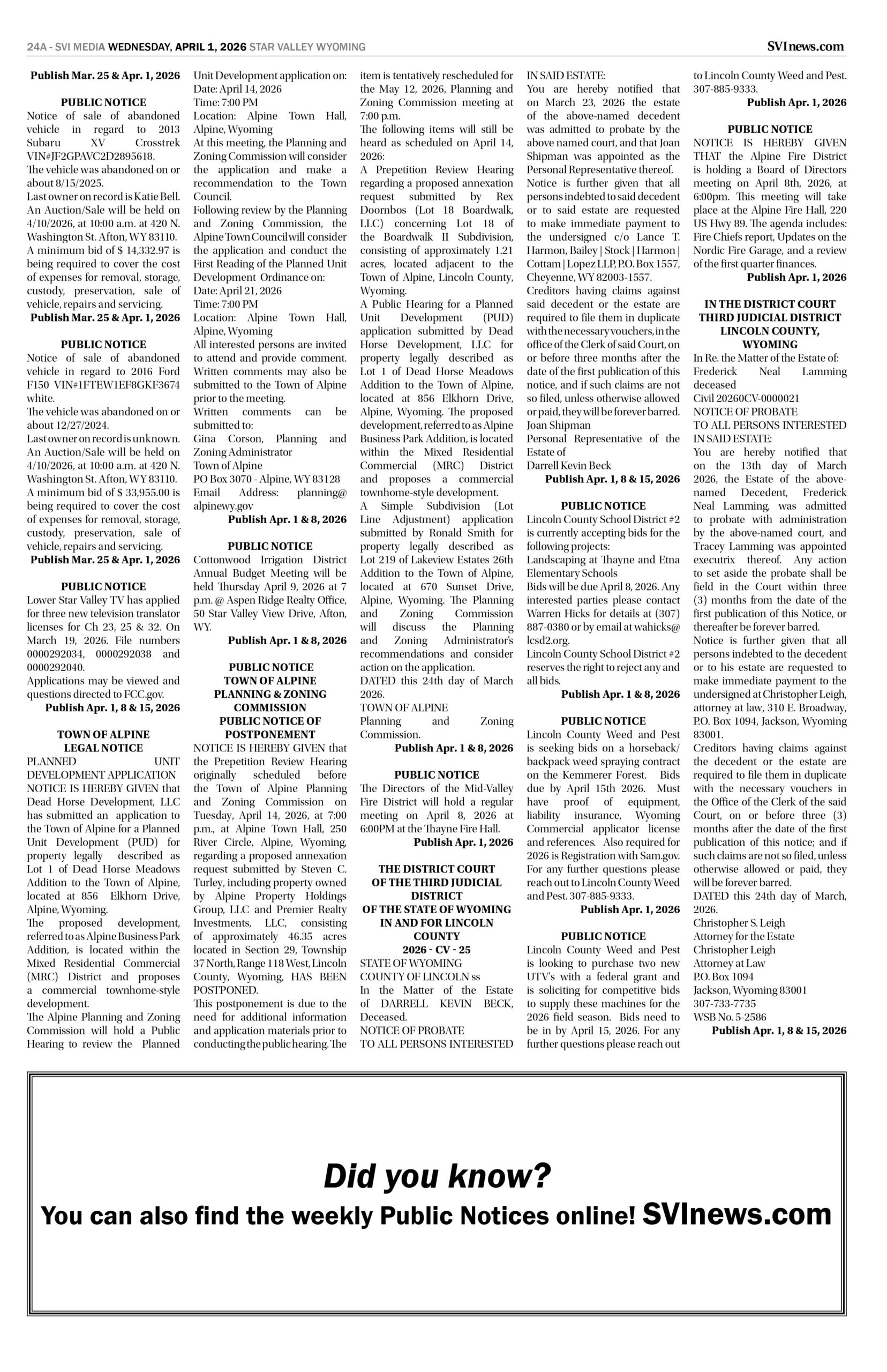 HomepagePublic NoticesApril 1, 2026 Star Valley Independent Public Notices Public Notices April 1, 2026 Star Valley Independent Public Notices Amanda Nelson Posted on March 31, 2026 Post Views: 34 Let us know what you think! +1 0 +1 0 +1 0 +1 0 +1 0 +1 0 LEAVE A RESPONSE Cancel replyYou must be logged in to post a comment. Post navigation Previous PostGame and Fish tests more than 5,300 samples for CWD in 2025 You Might Also Like Sports Spring practice underway at SVHS Dahl Erickson March 11, 2026 Featured Duke, Arizona, Michigan, Florida get top seeding for March Madness. Miami (Ohio) gets a shot AP March 16, 2026 Featured House, Senate vote to approve state budget Wyoming News Exchange March 3, 2026 Featured Vietnam Veterans to be Honored March 28 in Dubois SVI Staff March 3, 2026