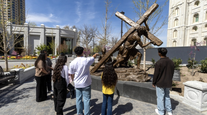 Outside the visitors’ center, patrons can enjoy landscaped gardens featuring bronze statues depicting scenes from Christ’s ministry and sacred historic moments. Two new statues, “Jesus Christ Carrying the Cross” and “Jesus Christ in Gethsemane,” sit outside the east and west wings. This and other areas around Temple Square offer space for contemplation and connection.