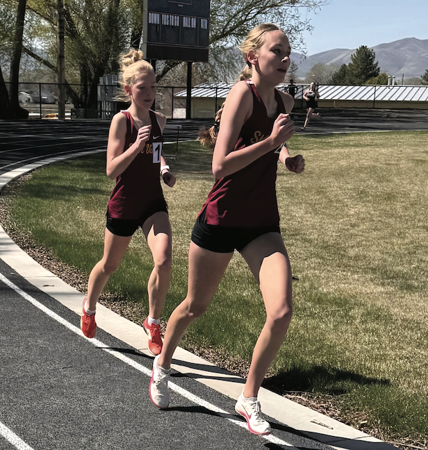 (Left) Gracie Dunne and Gracey Visser (Right) round the track in Malad. The Lady Braves will be back in action after Spring Break with an event at Sugar-Salem. PHOTO/ TY DRANEY