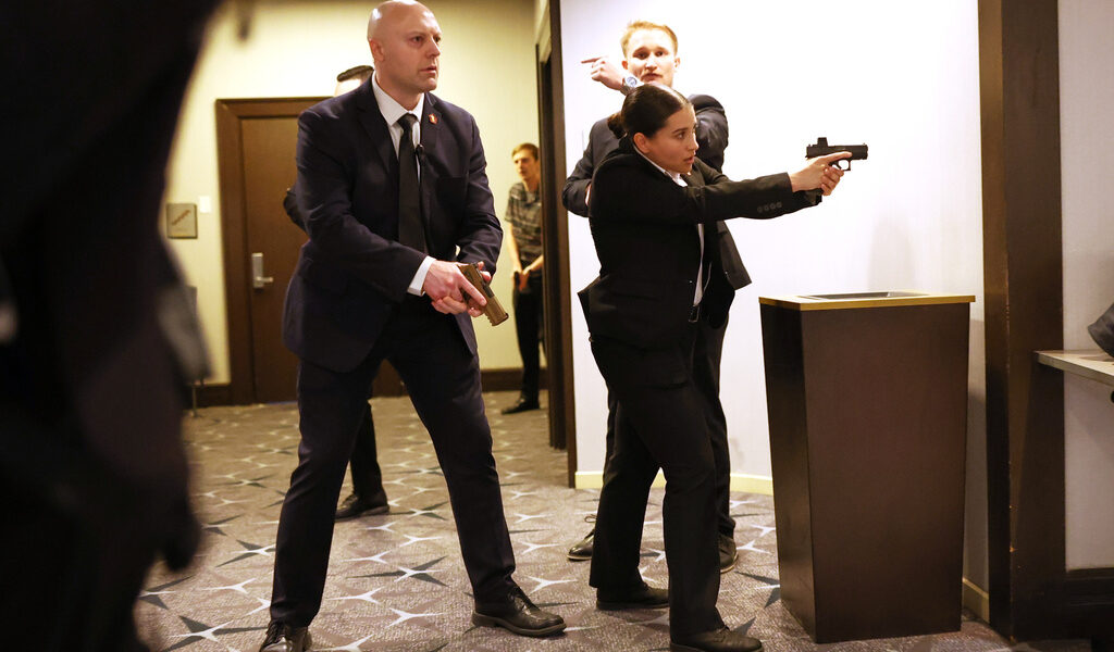“Out of the way, sir!” someone yelled. Others yelled to duck. From one corner, a “God Bless America” chant began as the president was escorted offstage. Outside the hotel, members of the National Guard and other authorities flooded the area as helicopters circled overhead.