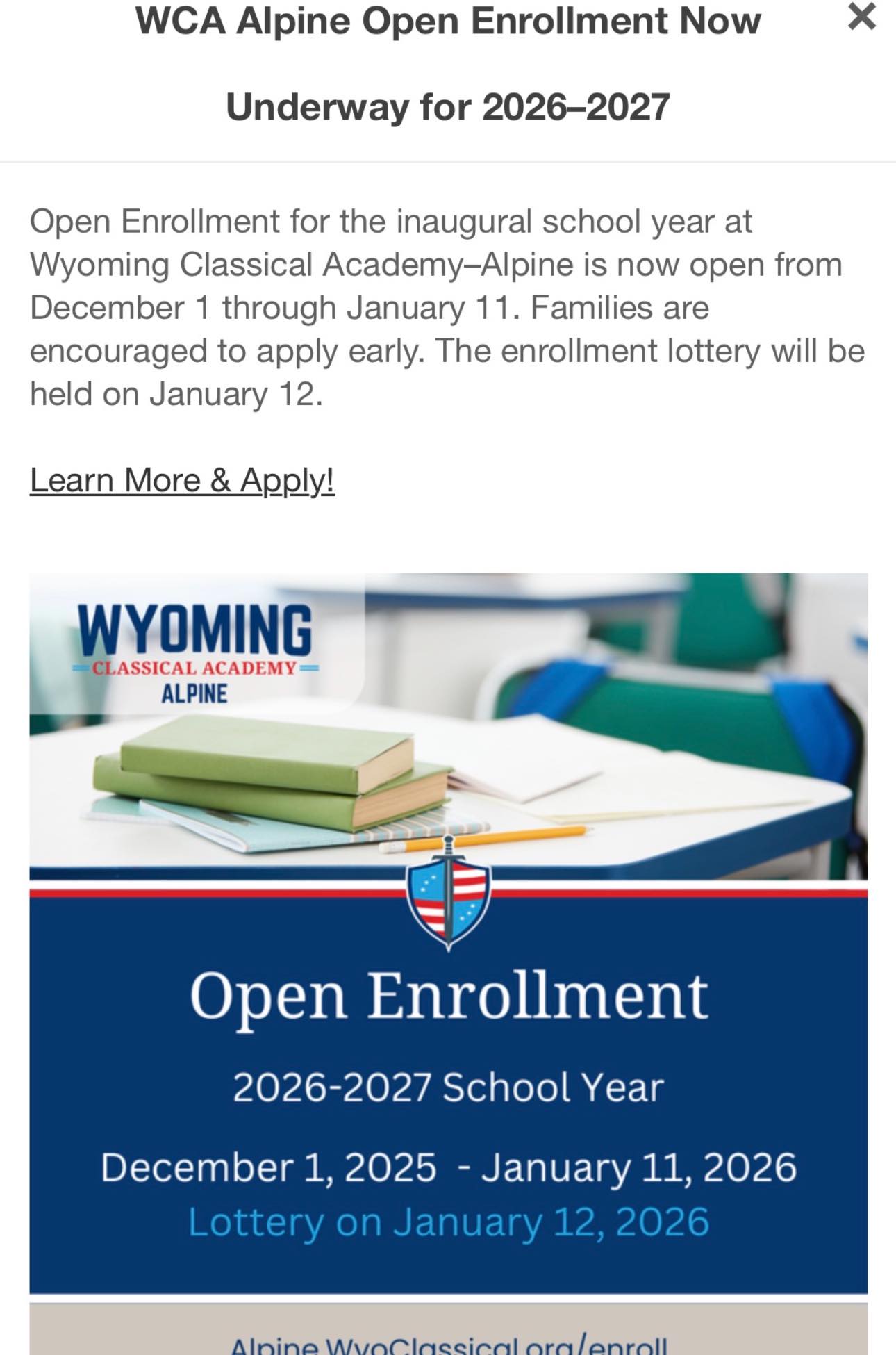 Alpine: Wyoming Classical Academy Alpine Charter School Open Enrollment Deadline