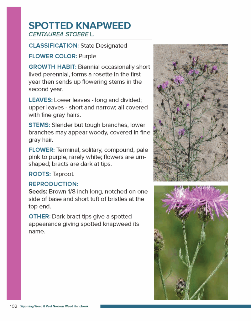 Spotted Knapweed is getting out of control. Please do your part by keeping your homes and businesses clear of this noxious weed. See the below information to help you identify Spotted Knapweed on your property.